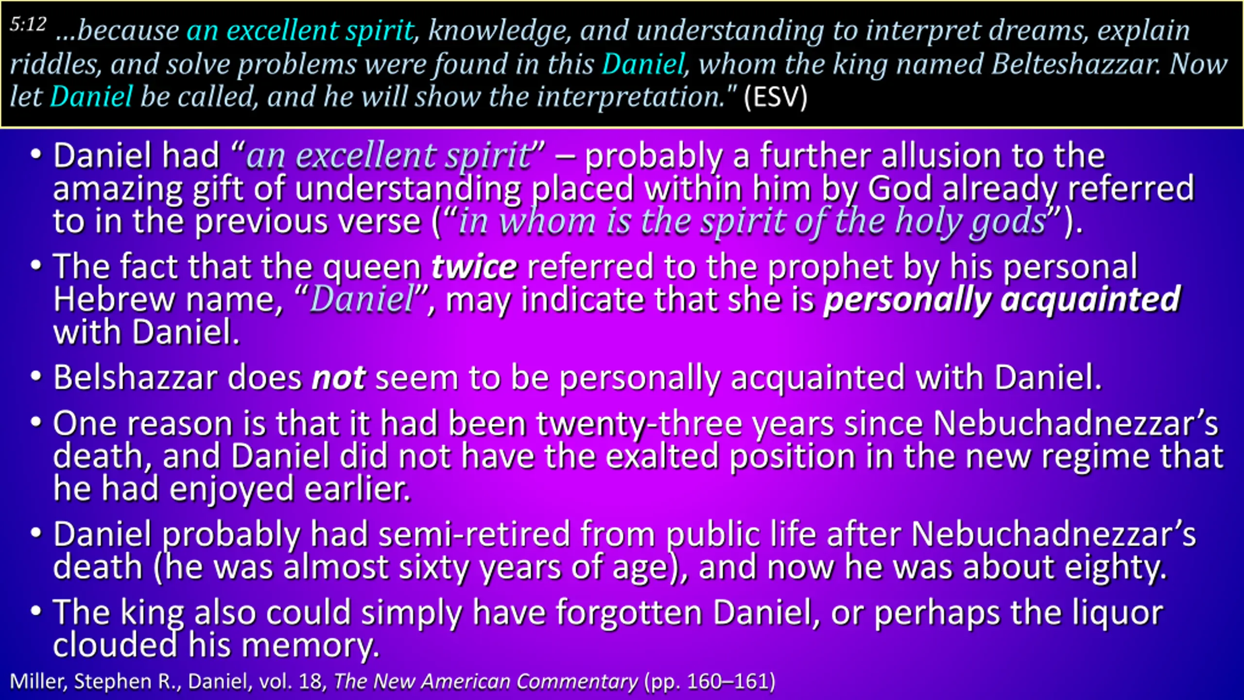 5:12because an excellent spirit, knowledge, and understanding to interpret dreams, explain riddles, and solve problems were found in this Daniel, whom the king named Belteshazzar. Now let Daniel be called, and he will show the interpretation." (ESV) Daniel had an excellent spirit probably a further allusion to the amazing gift of understanding placed within him by God already referred to in the previous verse ( in whom is the spirit of the holy gods ). The fact that the queen twice referred to the prophet by his personal Hebrew name, Daniel , may indicate that she is personally acquainted with Daniel. Belshazzar does not seem to be personally acquainted with Daniel. One reason is that it had been twenty-three years since Nebuchadnezzar s death, and Daniel did not have the exalted position in the new regime that he had enjoyed earlier. Daniel probably had semi-retired from public life after Nebuchadnezzar s death (he was almost sixty years of age), and now he was about eighty. The king also could simply have forgotten Daniel, or perhaps the liquor clouded his memory. Miller, Stephen R., Daniel, vol. 18, The New American Commentary (pp. 160 161)