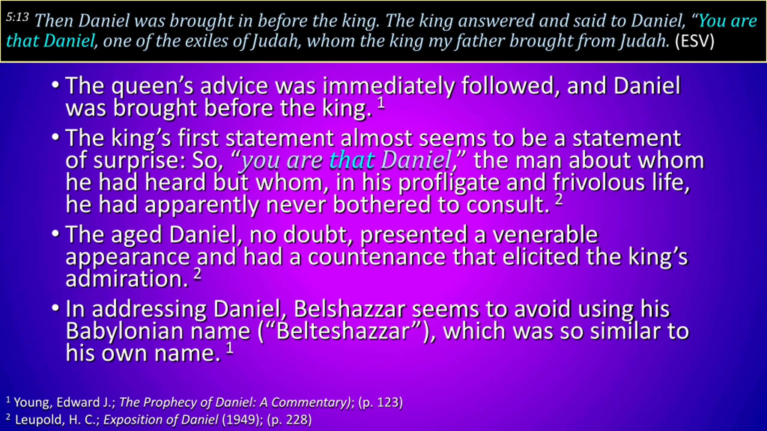 5:13Then Daniel was brought in before the king. The king answered and said to Daniel, You are that Daniel, one of the exiles of Judah, whom the king my father brought from Judah. (ESV) The queen s advice was immediately followed, and Daniel was brought before the king. 1 The king s first statement almost seems to be a statement of surprise: So, you are that Daniel, the man about whom he had heard but whom, in his profligate and frivolous life, he had apparently never bothered to consult. 2 The aged Daniel, no doubt, presented a venerable appearance and had a countenance that elicited the king s admiration. 2 In addressing Daniel, Belshazzar seems to avoid using his Babylonian name ( Belteshazzar ), which was so similar to his own name. 1 1 Young, Edward J.; The Prophecy of Daniel: A Commentary); (p. 123) 2 Leupold, H. C.; Exposition of Daniel (1949); (p. 228)