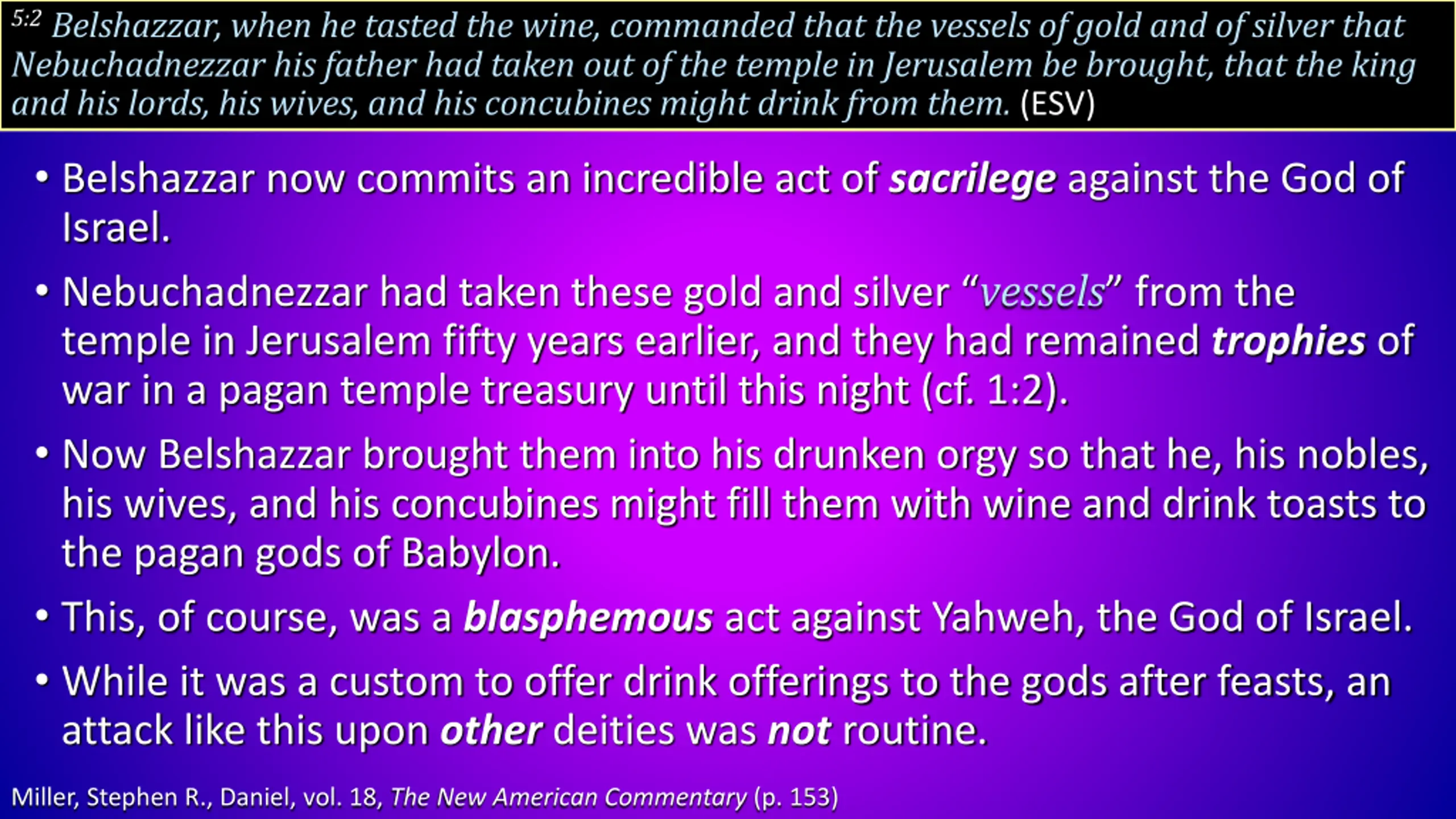 5:2 Belshazzar, when he tasted the wine, commanded that the vessels of gold and of silver that Nebuchadnezzar his father had taken out of the temple in Jerusalem be brought, that the king and his lords, his wives, and his concubines might drink from them. (ESV) Belshazzar now commits an incredible act of sacrilege against the God of Israel. Nebuchadnezzar had taken these gold and silver vessels from the temple in Jerusalem fifty years earlier, and they had remained trophies of war in a pagan temple treasury until this night (cf. 1:2). Now Belshazzar brought them into his drunken orgy so that he, his nobles, his wives, and his concubines might fill them with wine and drink toasts to the pagan gods of Babylon. This, of course, was a blasphemous act against Yahweh, the God of Israel. While it was a custom to offer drink offerings to the gods after feasts, an attack like this upon other deities was not routine. Miller, Stephen R., Daniel, vol. 18, The New American Commentary (p. 153)