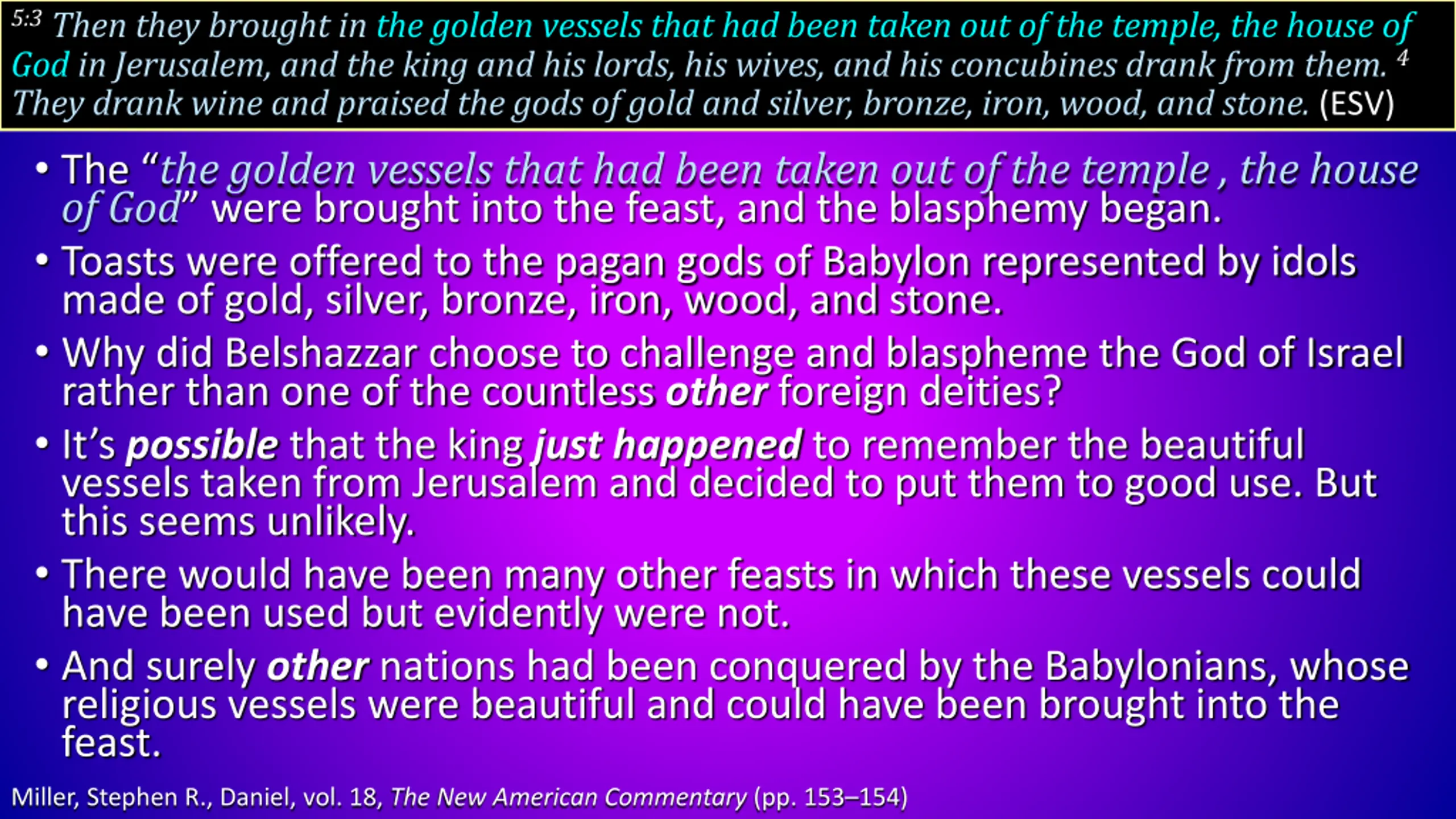 5:3 Then they brought in the golden vessels that had been taken out of the temple, the house of God in Jerusalem, and the king and his lords, his wives, and his concubines drank from them. 4 They drank wine and praised the gods of gold and silver, bronze, iron, wood, and stone. (ESV) The the golden vessels that had been taken out of the temple , the house of God were brought into the feast, and the blasphemy began. Toasts were offered to the pagan gods of Babylon represented by idols made of gold, silver, bronze, iron, wood, and stone. Why did Belshazzar choose to challenge and blaspheme the God of Israel rather than one of the countless other foreign deities? It s possible that the king just happened to remember the beautiful vessels taken from Jerusalem and decided to put them to good use. But this seems unlikely. There would have been many other feasts in which these vessels could have been used but evidently were not. And surely other nations had been conquered by the Babylonians, whose religious vessels were beautiful and could have been brought into the feast. Miller, Stephen R., Daniel, vol. 18, The New American Commentary (pp. 153 154)