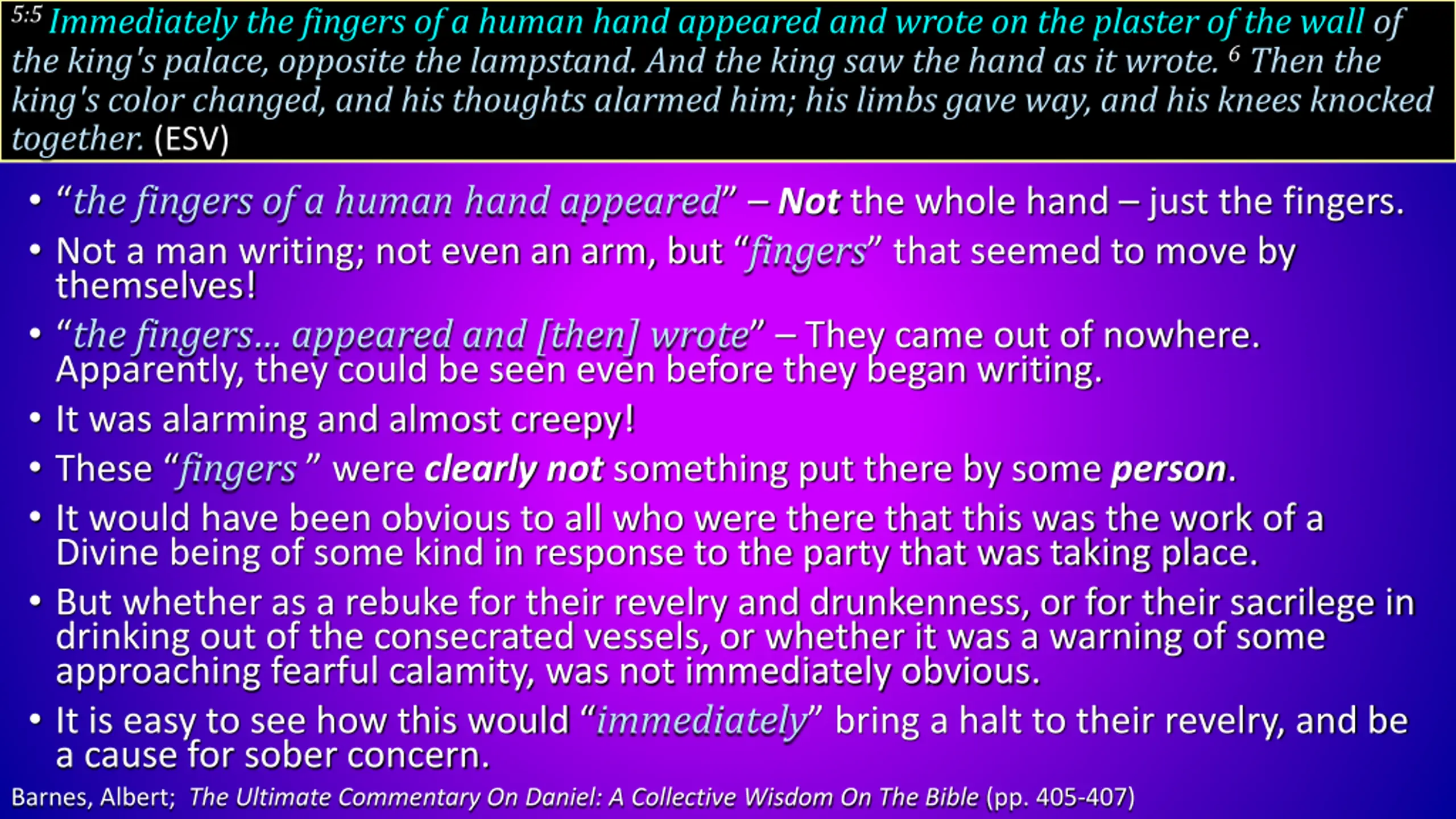 5:5 Immediately the fingers of a human hand appeared and wrote on the plaster of the wall of the king's palace, opposite the lampstand. And the king saw the hand as it wrote. 6 Then the king's color changed, and his thoughts alarmed him; his limbs gave way, and his knees knocked together. (ESV) the fingers of a human hand appeared Not the whole hand just the fingers. Not a man writing; not even an arm, but fingers that seemed to move by themselves! the fingers appeared and [then] wrote They came out of nowhere. Apparently, they could be seen even before they began writing. It was alarming and almost creepy! These fingers were clearlynot something put there by some person. It would have been obvious to all who were there that this was the work of a Divine being of some kind in response to the party that was taking place. But whether as a rebuke for their revelry and drunkenness, or for their sacrilege in drinking out of the consecrated vessels, or whether it was a warning of some approaching fearful calamity, was not immediately obvious. It is easy to see how this would immediately bring a halt to their revelry, and be a cause for sober concern. Barnes, Albert; The Ultimate Commentary On Daniel: A Collective Wisdom On The Bible (pp. 405-407)