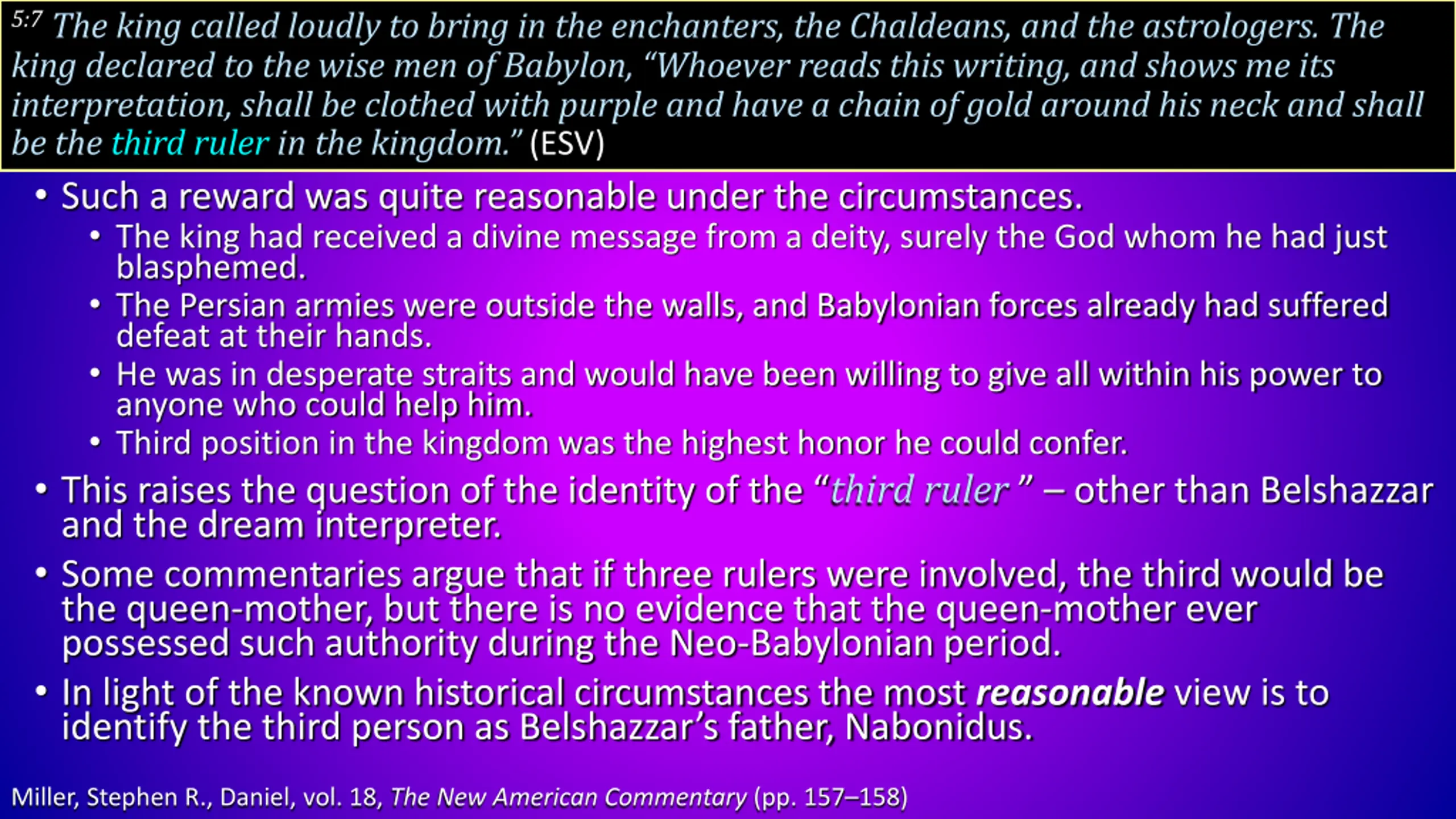 5:7 The king called loudly to bring in the enchanters, the Chaldeans, and the astrologers. The king declared to the wise men of Babylon, Whoever reads this writing, and shows me its interpretation, shall be clothed with purple and have a chain of gold around his neck and shall be the third ruler in the kingdom. (ESV) Such a reward was quite reasonable under the circumstances. The king had received a divine message from a deity, surely the God whom he had just blasphemed. The Persian armies were outside the walls, and Babylonian forces already had suffered defeat at their hands. He was in desperate straits and would have been willing to give all within his power to anyone who could help him. Third position in the kingdom was the highest honor he could confer. This raises the question of the identity of the third ruler other than Belshazzar and the dream interpreter. Some commentaries argue that if three rulers were involved, the third would be the queen-mother, but there is no evidence that the queen-mother ever possessed such authority during the Neo-Babylonian period. In light of the known historical circumstances the most reasonable view is to identify the third person as Belshazzar s father, Nabonidus. Miller, Stephen R., Daniel, vol. 18, The New American Commentary (pp. 157 158)