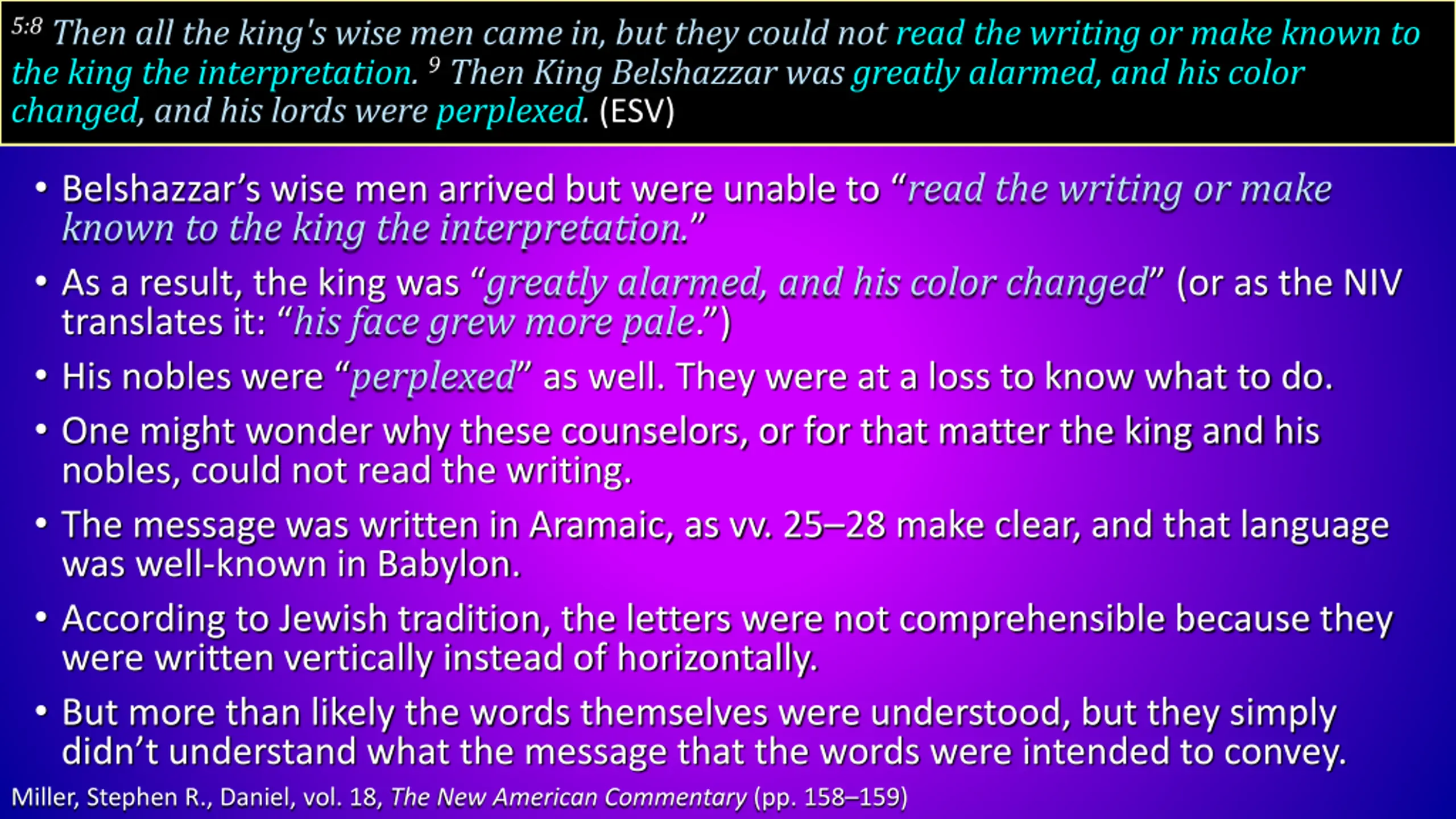 5:8 Then all the king's wise men came in, but they could not read the writing or make known to the king the interpretation. 9 Then King Belshazzar was greatly alarmed, and his color changed, and his lords were perplexed. (ESV) Belshazzar s wise men arrived but were unable to read the writing or make known to the king the interpretation. As a result, the king was greatly alarmed, and his color changed (or as the NIV translates it: his face grew more pale. ) His nobles were perplexed as well. They were at a loss to know what to do. One might wonder why these counselors, or for that matter the king and his nobles, could not read the writing. The message was written in Aramaic, as vv. 25 28 make clear, and that language was well-known in Babylon. According to Jewish tradition, the letters were not comprehensible because they were written vertically instead of horizontally. But more than likely the words themselves were understood, but they simply didn t understand what the message that the words were intended to convey. Miller, Stephen R., Daniel, vol. 18, The New American Commentary (pp. 158 159)