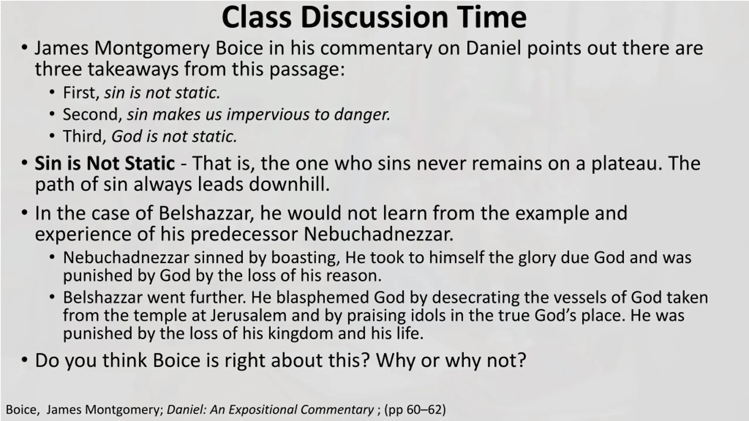 Class Discussion Time James Montgomery Boice in his commentary on Daniel points out there are three takeaways from this passage: First, sin is not static. Second, sin makes us impervious to danger. Third, God is not static. Sin is Not Static - That is, the one who sins never remains on a plateau. The path of sin always leads downhill. In the case of Belshazzar, he would not learn from the example and experience of his predecessor Nebuchadnezzar. Nebuchadnezzar sinned by boasting, He took to himself the glory due God and was punished by God by the loss of his reason. Belshazzar went further. He blasphemed God by desecrating the vessels of God taken from the temple at Jerusalem and by praising idols in the true God s place. He was punished by the loss of his kingdom and his life. Do you think Boice is right about this? Why or why not? Boice, James Montgomery; Daniel: An Expositional Commentary ; (pp 60 62)