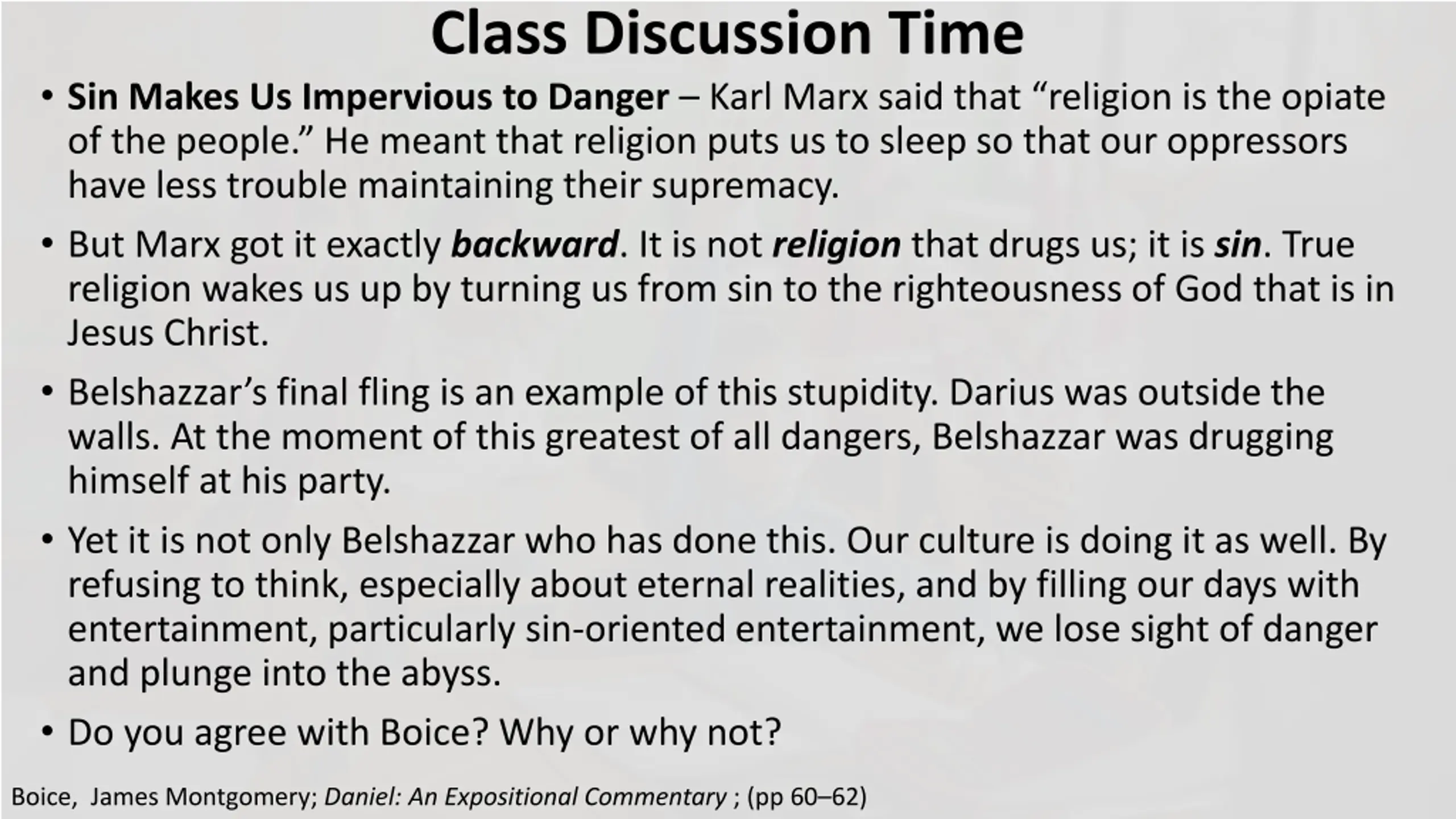 Class Discussion Time Sin Makes Us Impervious to Danger Karl Marx said that religion is the opiate of the people. He meant that religion puts us to sleep so that our oppressors have less trouble maintaining their supremacy. But Marx got it exactly backward. It is not religion that drugs us; it is sin. True religion wakes us up by turning us from sin to the righteousness of God that is in Jesus Christ. Belshazzar s final fling is an example of this stupidity. Darius was outside the walls. At the moment of this greatest of all dangers, Belshazzar was drugging himself at his party. Yet it is not only Belshazzar who has done this. Our culture is doing it as well. By refusing to think, especially about eternal realities, and by filling our days with entertainment, particularly sin-oriented entertainment, we lose sight of danger and plunge into the abyss. Do you agree with Boice? Why or why not? Boice, James Montgomery; Daniel: An Expositional Commentary ; (pp 60 62)