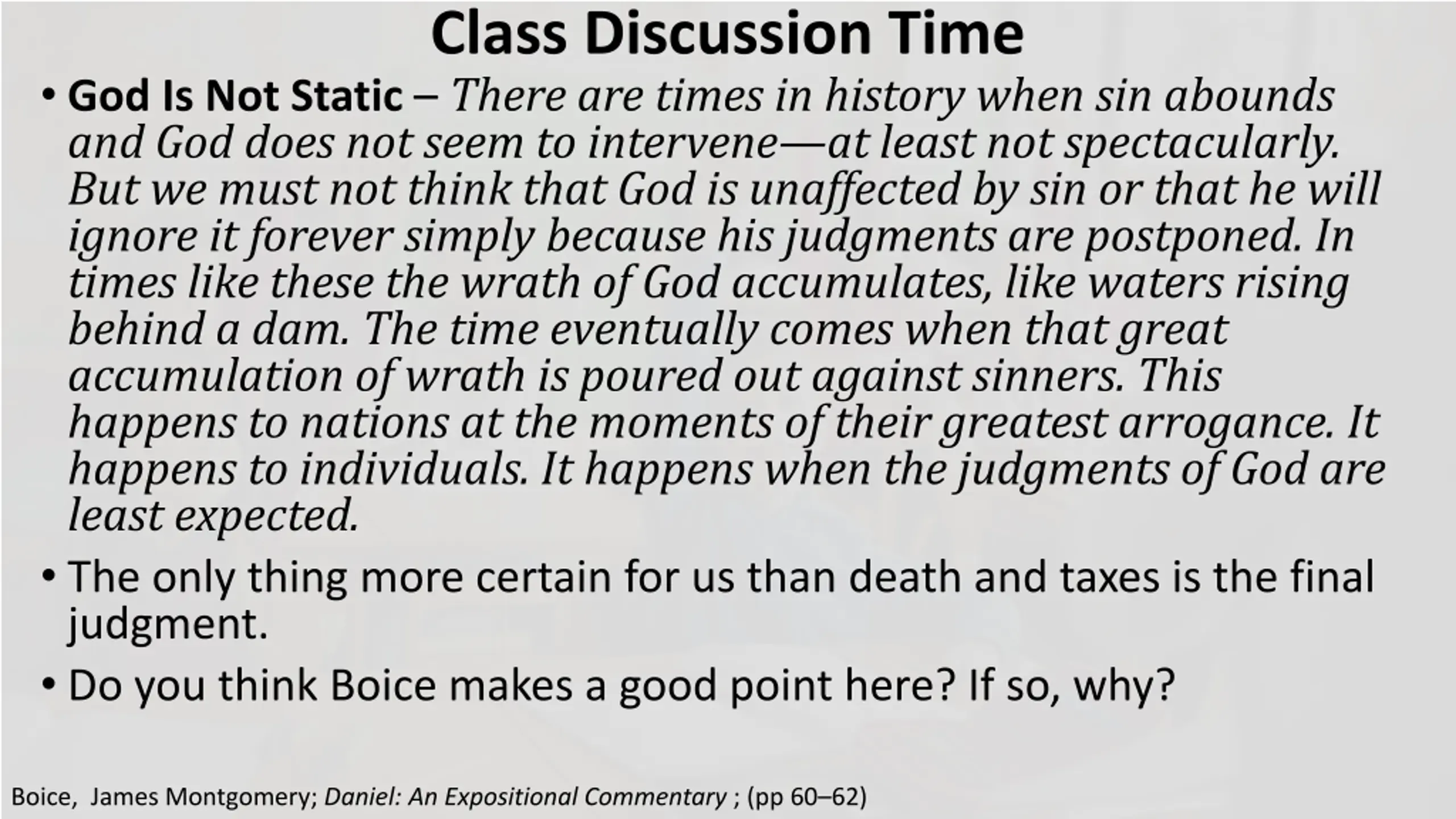 Class Discussion Time God Is Not Static There are times in history when sin abounds and God does not seem to intervene at least not spectacularly. But we must not think that God is unaffected by sin or that he will ignore it forever simply because his judgments are postponed. In times like these the wrath of God accumulates, like waters rising behind a dam. The time eventually comes when that great accumulation of wrath is poured out against sinners. This happens to nations at the moments of their greatest arrogance. It happens to individuals. It happens when the judgments of God are least expected. The only thing more certain for us than death and taxes is the final judgment. Do you think Boice makes a good point here? If so, why? Boice, James Montgomery; Daniel: An Expositional Commentary ; (pp 60 62)
