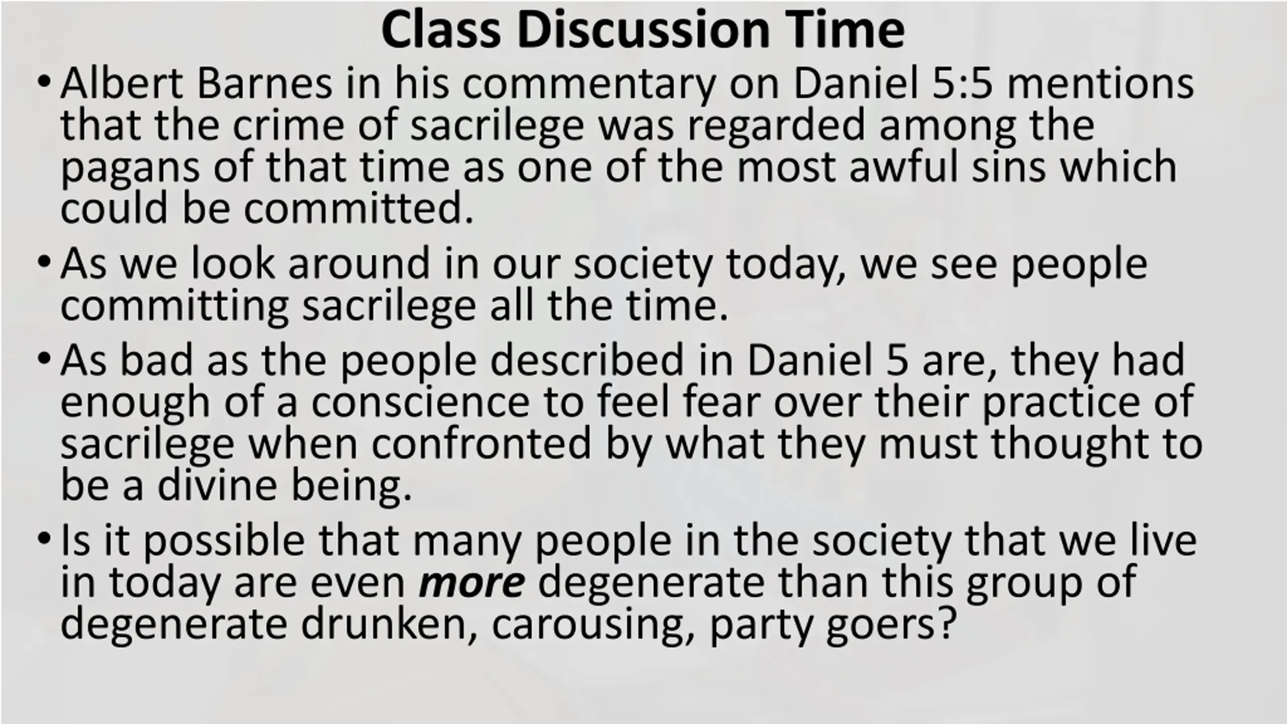Class Discussion Time Albert Barnes in his commentary on Daniel 5:5 mentions that the crime of sacrilege was regarded among the pagans of that time as one of the most awful sins which could be committed. As we look around in our society today, we see people committing sacrilege all the time. As bad as the people described in Daniel 5 are, they had enough of a conscience to feel fear over their practice of sacrilege when confronted by what they must thought to be a divine being. Is it possible that many people in the society that we live in today are even more degenerate than this group of degenerate drunken, carousing, party goers?