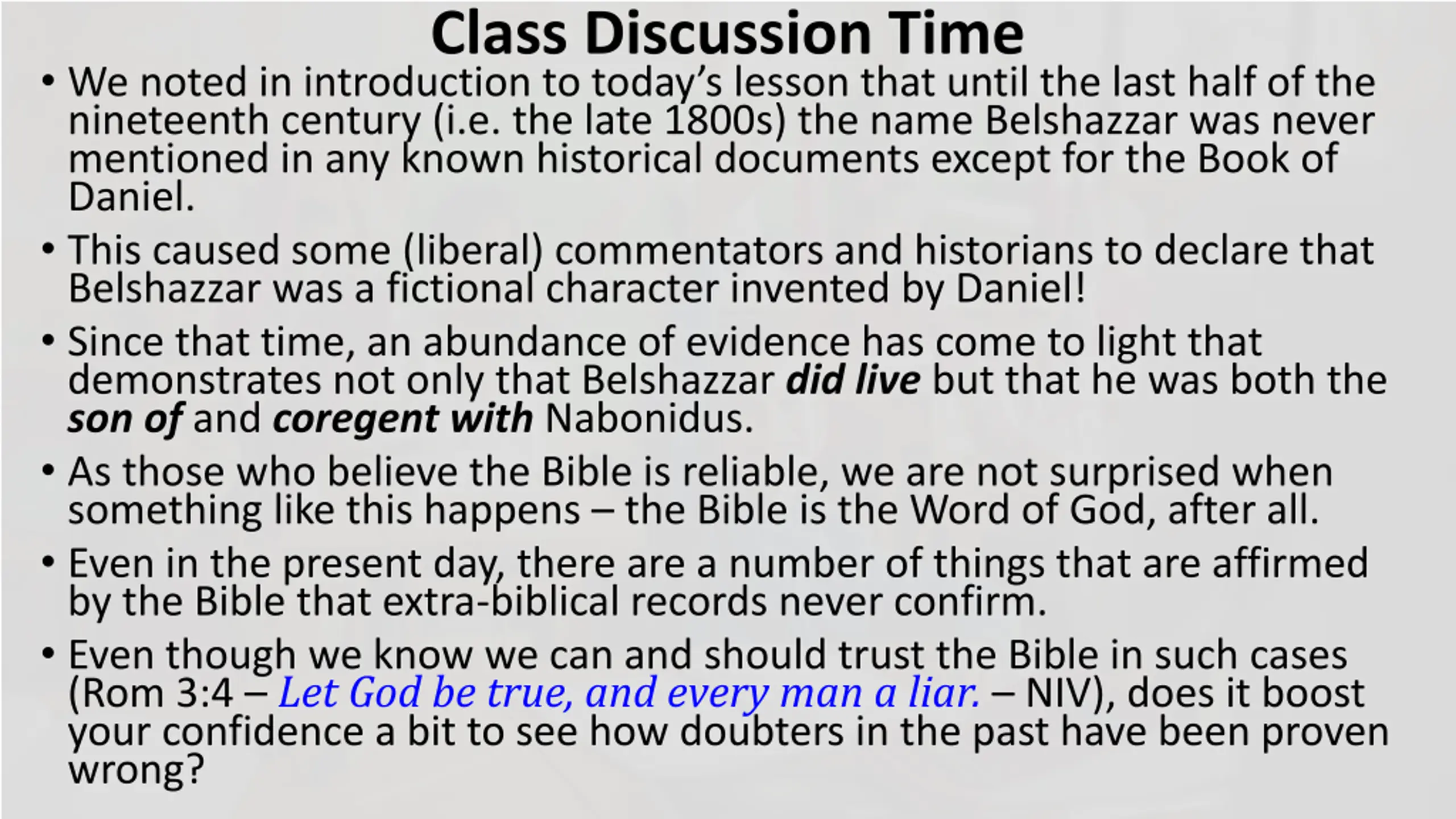 Class Discussion Time We noted in introduction to today s lesson that until the last half of the nineteenth century (i.e. the late 1800s) the name Belshazzar was never mentioned in any known historical documents except for the Book of Daniel. This caused some (liberal) commentators and historians to declare that Belshazzar was a fictional character invented by Daniel! Since that time, an abundance of evidence has come to light that demonstrates not only that Belshazzar did live but that he was both the son of and coregent with Nabonidus. As those who believe the Bible is reliable, we are not surprised when something like this happens the Bible is the Word of God, after all. Even in the present day, there are a number of things that are affirmed by the Bible that extra-biblical records never confirm. Even though we know we can and should trust the Bible in such cases (Rom 3:4 Let God be true, and every man a liar. NIV), does it boost your confidence a bit to see how doubters in the past have been proven wrong?