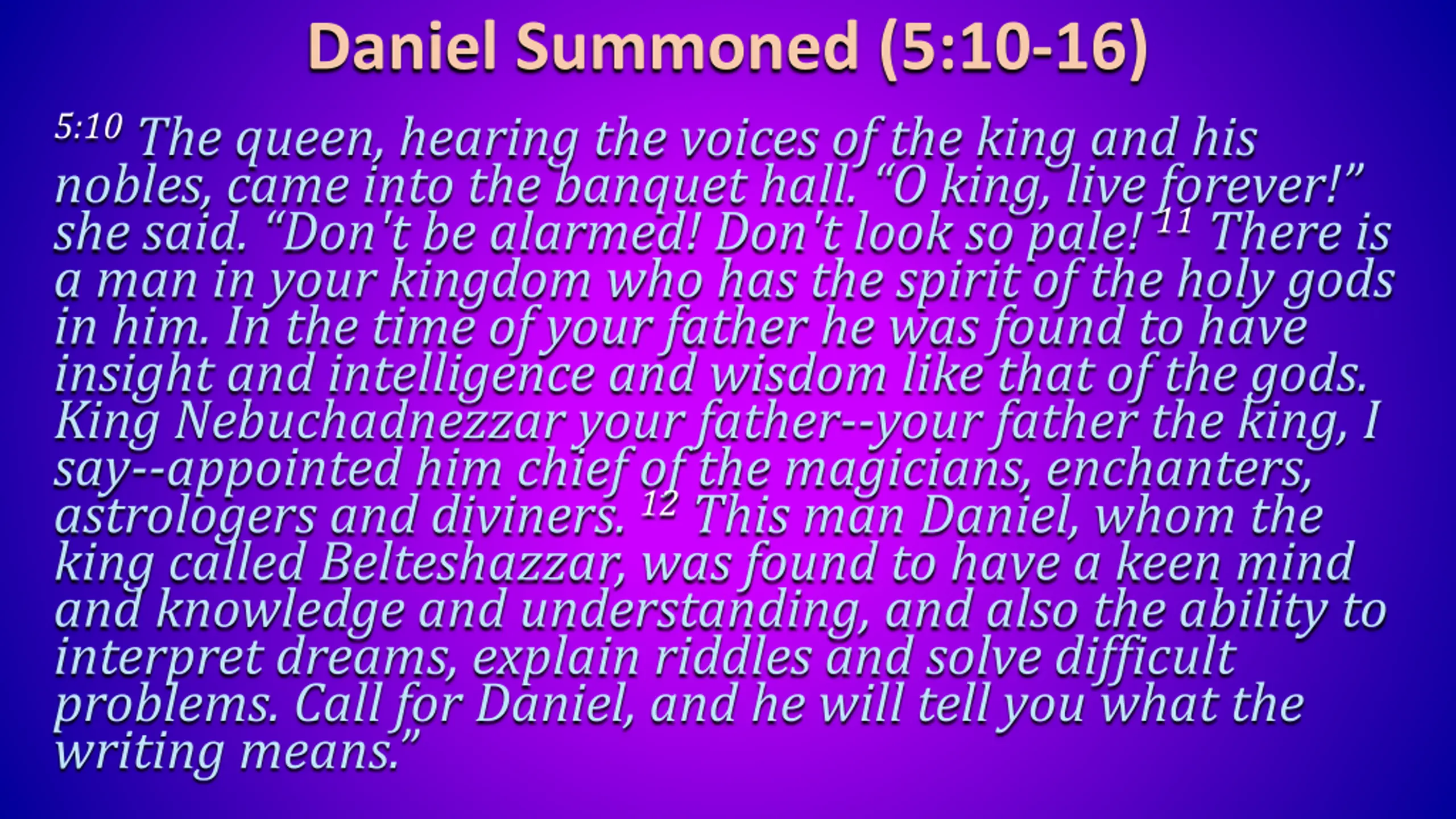 Daniel Summoned (5:10-16) 5:10 The queen, hearing the voices of the king and his nobles, came into the banquet hall. O king, live forever! she said. Don't be alarmed! Don't look so pale! 11 There is a man in your kingdom who has the spirit of the holy gods in him. In the time of your father he was found to have insight and intelligence and wisdom like that of the gods. King Nebuchadnezzar your father--your father the king, I say--appointed him chief of the magicians, enchanters, astrologers and diviners. 12 This man Daniel, whom the king called Belteshazzar, was found to have a keen mind and knowledge and understanding, and also the ability to interpret dreams, explain riddles and solve difficult problems. Call for Daniel, and he will tell you what the writing means.