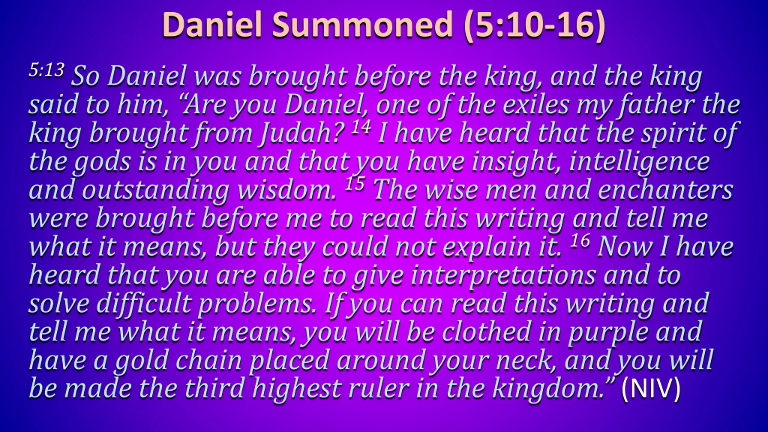 Daniel Summoned (5:10-16) 5:13 So Daniel was brought before the king, and the king said to him, Are you Daniel, one of the exiles my father the king brought from Judah? 14 I have heard that the spirit of the gods is in you and that you have insight, intelligence and outstanding wisdom. 15 The wise men and enchanters were brought before me to read this writing and tell me what it means, but they could not explain it. 16 Now I have heard that you are able to give interpretations and to solve difficult problems. If you can read this writing and tell me what it means, you will be clothed in purple and have a gold chain placed around your neck, and you will be made the third highest ruler in the kingdom. (NIV)