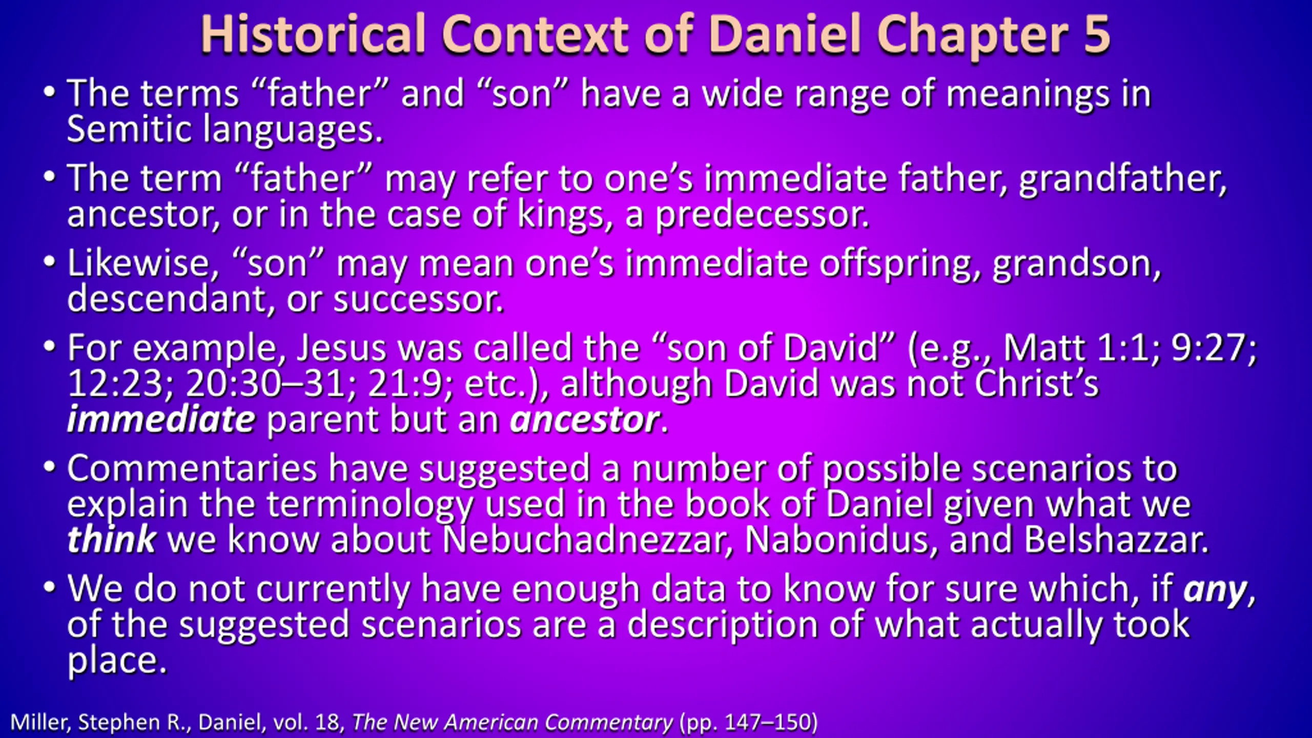 Historical Context of Daniel Chapter 5 The terms father and son have a wide range of meanings in Semitic languages. The term father may refer to one s immediate father, grandfather, ancestor, or in the case of kings, a predecessor. Likewise, son may mean one s immediate offspring, grandson, descendant, or successor. For example, Jesus was called the son of David (e.g., Matt 1:1; 9:27; 12:23; 20:30 31; 21:9; etc.), although David was not Christ s immediate parent but an ancestor. Commentaries have suggested a number of possible scenarios to explain the terminology used in the book of Daniel given what we think we know about Nebuchadnezzar, Nabonidus, and Belshazzar. We do not currently have enough data to know for sure which, if any, of the suggested scenarios are a description of what actually took place. Miller, Stephen R., Daniel, vol. 18, The New American Commentary (pp. 147 150)