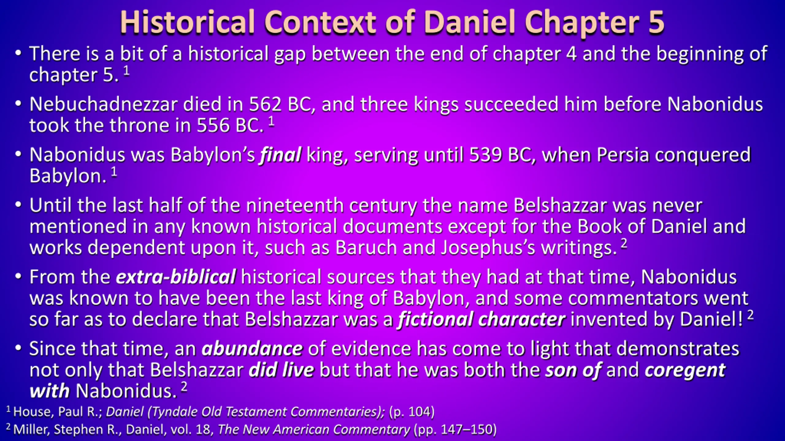 Historical Context of Daniel Chapter 5 There is a bit of a historical gap between the end of chapter 4 and the beginning of chapter 5. 1 Nebuchadnezzar died in 562 BC, and three kings succeeded him before Nabonidus took the throne in 556 BC. 1 Nabonidus was Babylon s final king, serving until 539 BC, when Persia conquered Babylon. 1 Until the last half of the nineteenth century the name Belshazzar was never mentioned in any known historical documents except for the Book of Daniel and works dependent upon it, such as Baruch and Josephus s writings. 2 From the extra-biblical historical sources that they had at that time, Nabonidus was known to have been the last king of Babylon, and some commentators went so far as to declare that Belshazzar was a fictional character invented by Daniel! 2 Since that time, an abundance of evidence has come to light that demonstrates not only that Belshazzar did live but that he was both the sonof and coregent with Nabonidus. 2 1 House, Paul R.; Daniel (Tyndale Old Testament Commentaries); (p. 104) 2 Miller, Stephen R., Daniel, vol. 18, The New American Commentary (pp. 147 150)