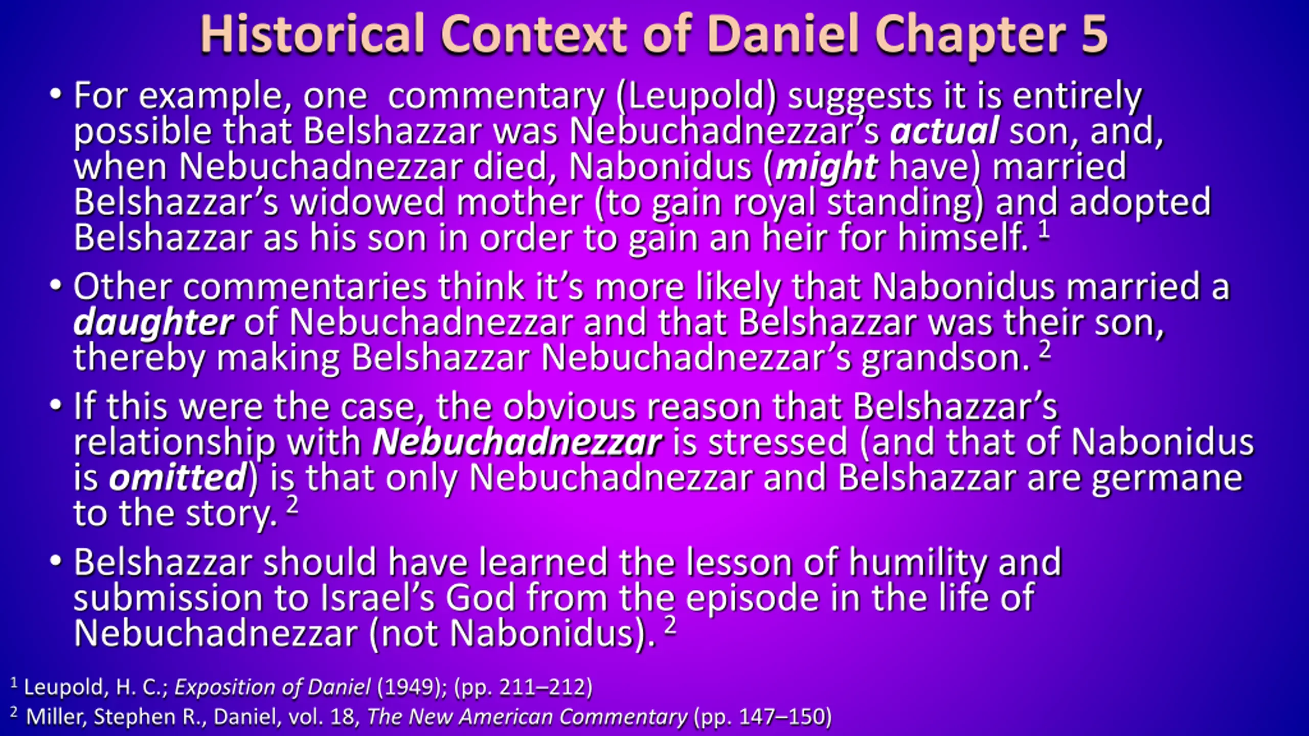 Historical Context of Daniel Chapter 5 For example, one commentary (Leupold) suggests it is entirely possible that Belshazzar was Nebuchadnezzar s actual son, and, when Nebuchadnezzar died, Nabonidus (might have) married Belshazzar s widowed mother (to gain royal standing) and adopted Belshazzar as his son in order to gain an heir for himself. 1 Other commentaries think it s more likely that Nabonidus married a daughter of Nebuchadnezzar and that Belshazzar was their son, thereby making Belshazzar Nebuchadnezzar s grandson. 2 If this were the case, the obvious reason that Belshazzar s relationship with Nebuchadnezzar is stressed (and that of Nabonidus is omitted) is that only Nebuchadnezzar and Belshazzar are germane to the story. 2 Belshazzar should have learned the lesson of humility and submission to Israel s God from the episode in the life of Nebuchadnezzar (not Nabonidus). 2 1 Leupold, H. C.; Exposition of Daniel (1949); (pp. 211 212) 2 Miller, Stephen R., Daniel, vol. 18, The New American Commentary (pp. 147 150)
