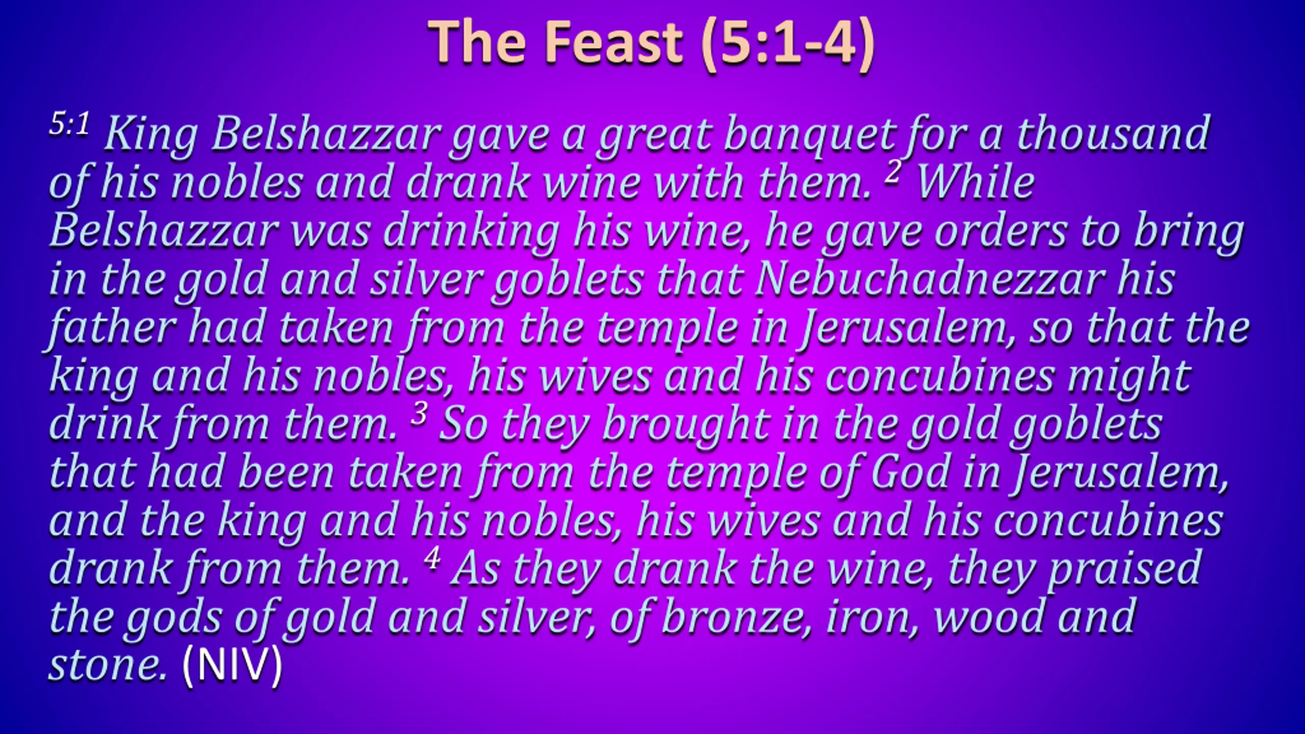 The Feast (5:1-4) 5:1 King Belshazzar gave a great banquet for a thousand of his nobles and drank wine with them. 2 While Belshazzar was drinking his wine, he gave orders to bring in the gold and silver goblets that Nebuchadnezzar his father had taken from the temple in Jerusalem, so that the king and his nobles, his wives and his concubines might drink from them. 3 So they brought in the gold goblets that had been taken from the temple of God in Jerusalem, and the king and his nobles, his wives and his concubines drank from them. 4 As they drank the wine, they praised the gods of gold and silver, of bronze, iron, wood and stone. (NIV)