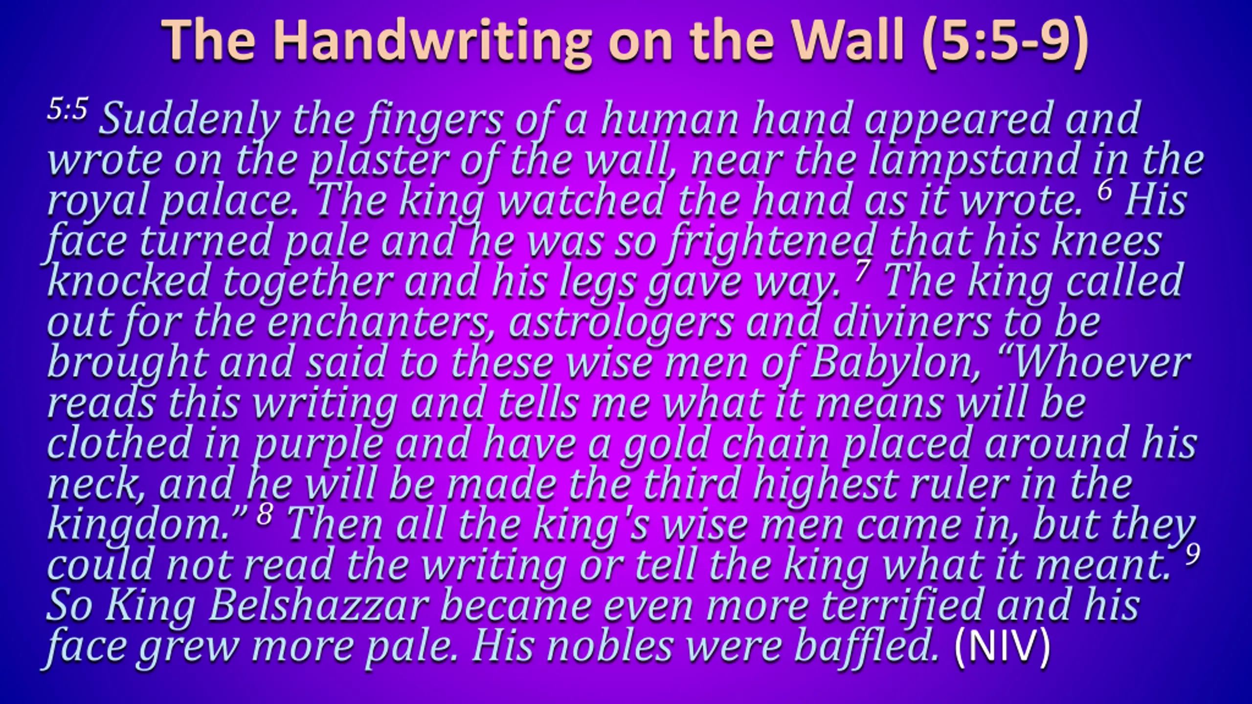 The Handwriting on the Wall (5:5-9) 5:5 Suddenly the fingers of a human hand appeared and wrote on the plaster of the wall, near the lampstand in the royal palace. The king watched the hand as it wrote. 6 His face turned pale and he was so frightened that his knees knocked together and his legs gave way. 7 The king called out for the enchanters, astrologers and diviners to be brought and said to these wise men of Babylon, Whoever reads this writing and tells me what it means will be clothed in purple and have a gold chain placed around his neck, and he will be made the third highest ruler in the kingdom. 8 Then all the king's wise men came in, but they could not read the writing or tell the king what it meant. 9 So King Belshazzar became even more terrified and his face grew more pale. His nobles were baffled. (NIV)