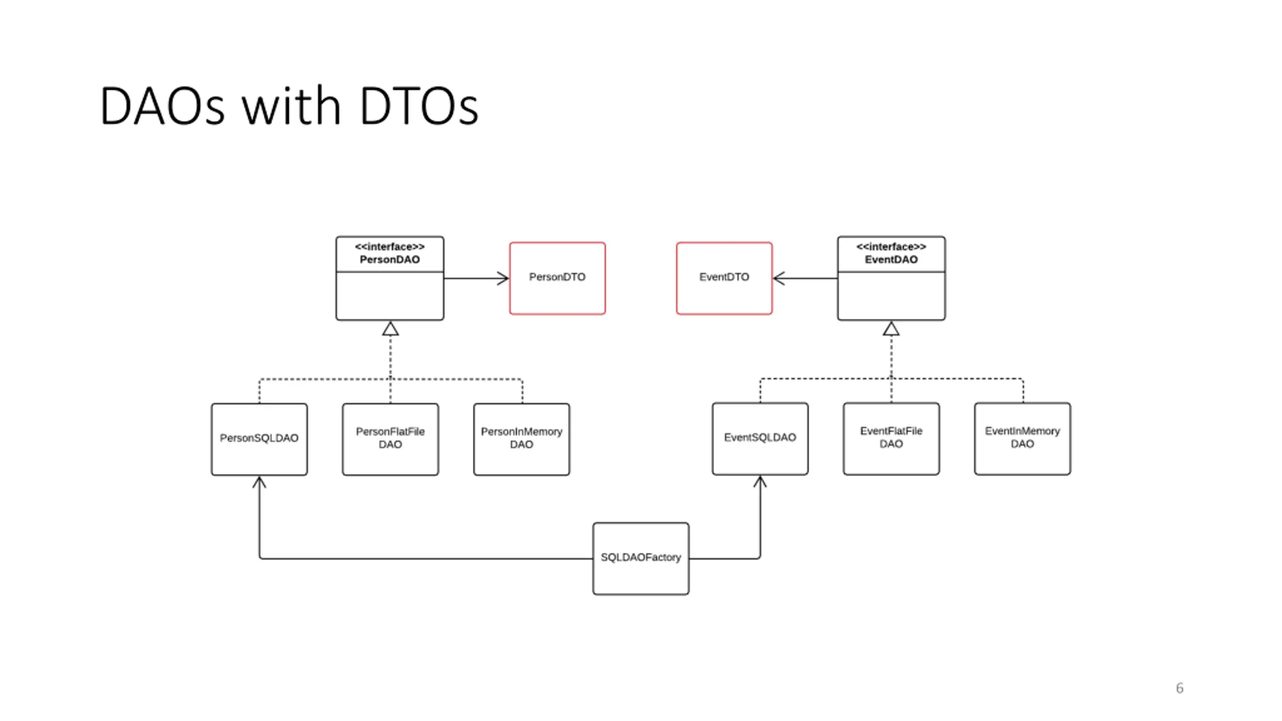 Data Transfer Objects (DTOs) Data-only (plus accessors) classes used to move (or transfer ) data from point A to point B in an application Moving data into and out of the Data Persistence subsystem Create, Update, Delete: DTOs passed into DAOs Read: DTOs passed out of DAOs Transferring data between client and server (typically over a network) Web API parameters Web API results 5