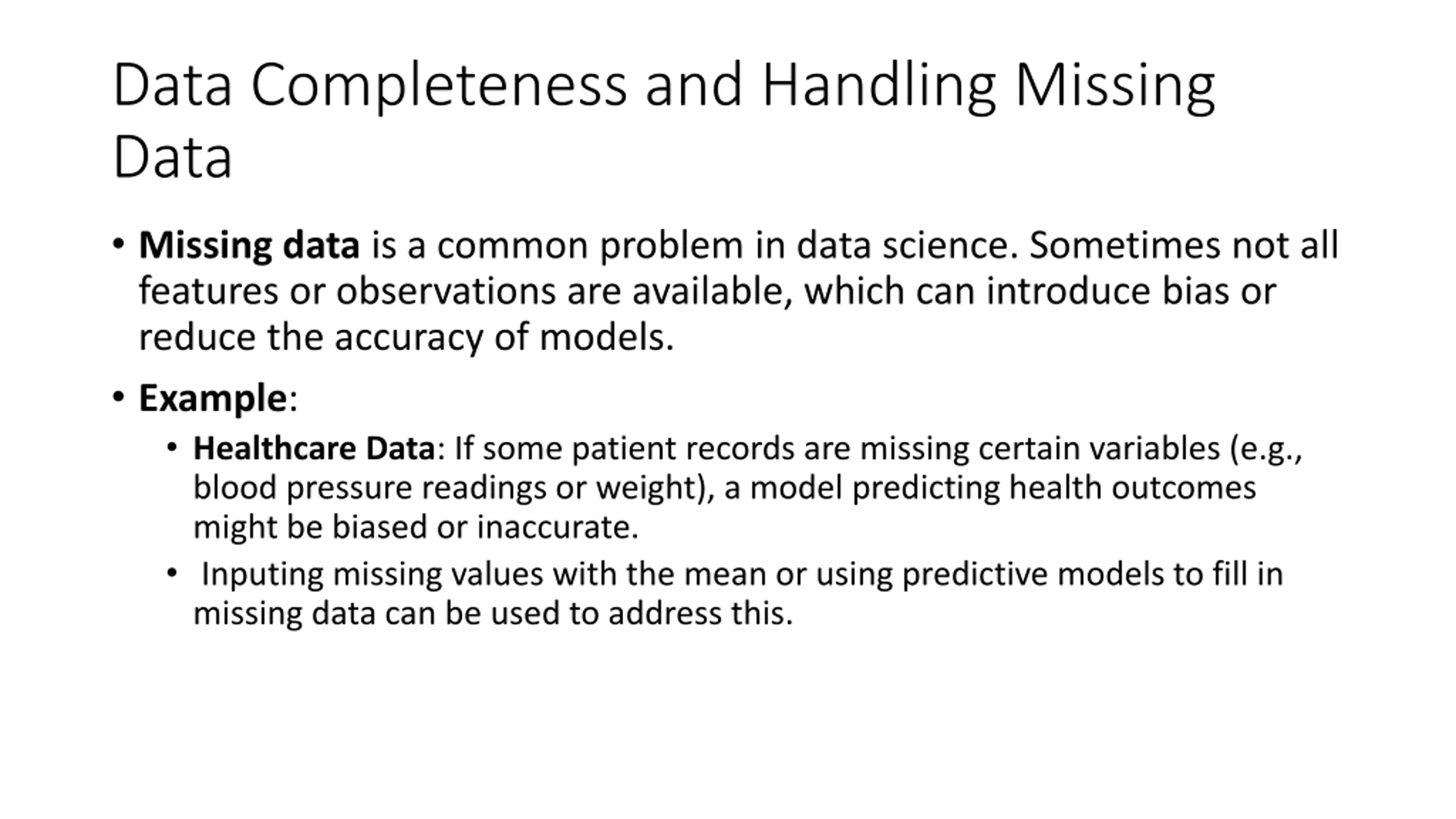 Data Completeness and Handling Missing Data Missing data is a common problem in data science. Sometimes not all features or observations are available, which can introduce bias or reduce the accuracy of models. Example: Healthcare Data: If some patient records are missing certain variables (e.g., blood pressure readings or weight), a model predicting health outcomes might be biased or inaccurate. Inputing missing values with the mean or using predictive models to fill in missing data can be used to address this.