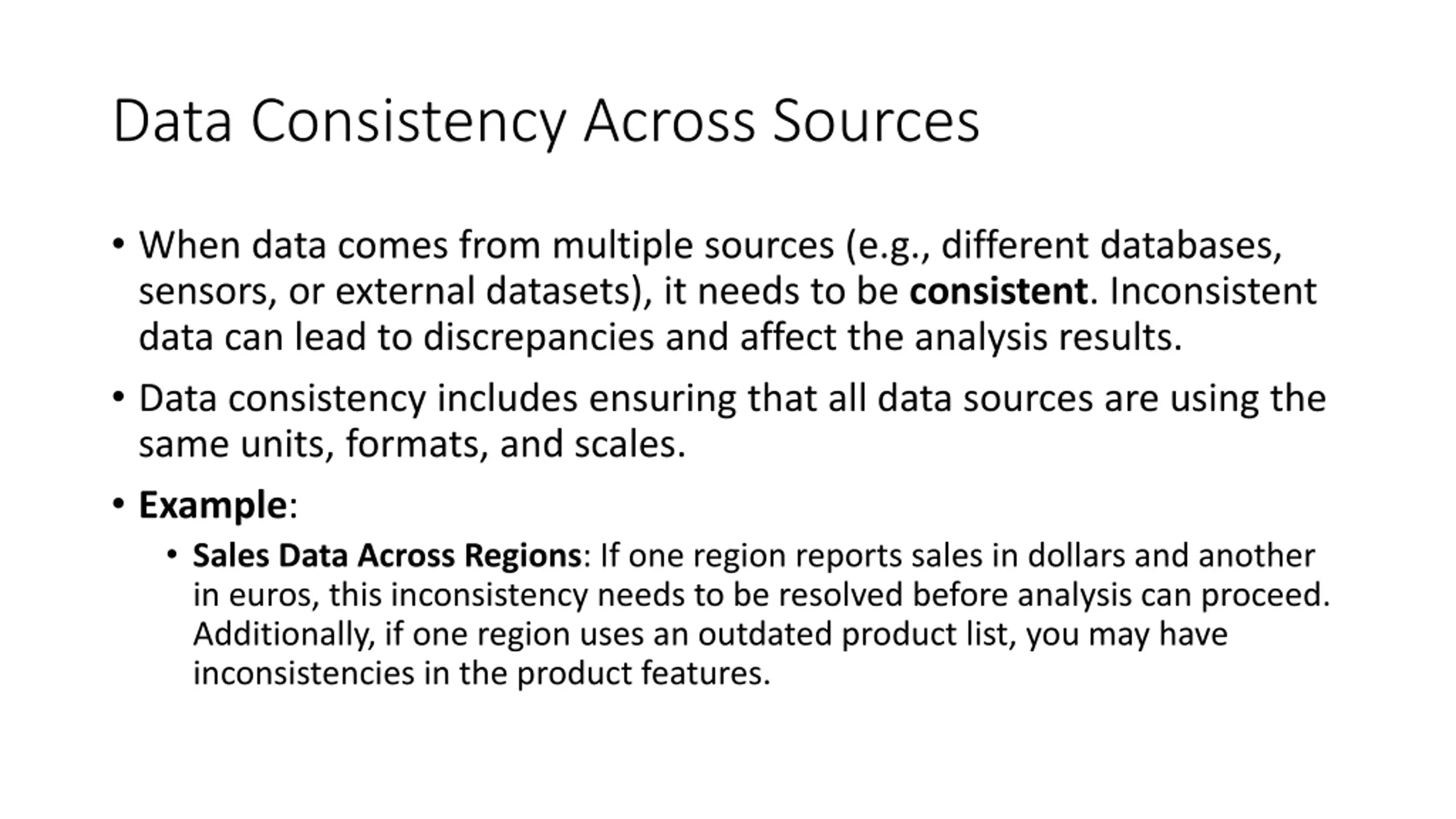 Data Consistency Across Sources When data comes from multiple sources (e.g., different databases, sensors, or external datasets), it needs to be consistent. Inconsistent data can lead to discrepancies and affect the analysis results. Data consistency includes ensuring that all data sources are using the same units, formats, and scales. Example: Sales Data Across Regions: If one region reports sales in dollars and another in euros, this inconsistency needs to be resolved before analysis can proceed. Additionally, if one region uses an outdated product list, you may have inconsistencies in the product features.