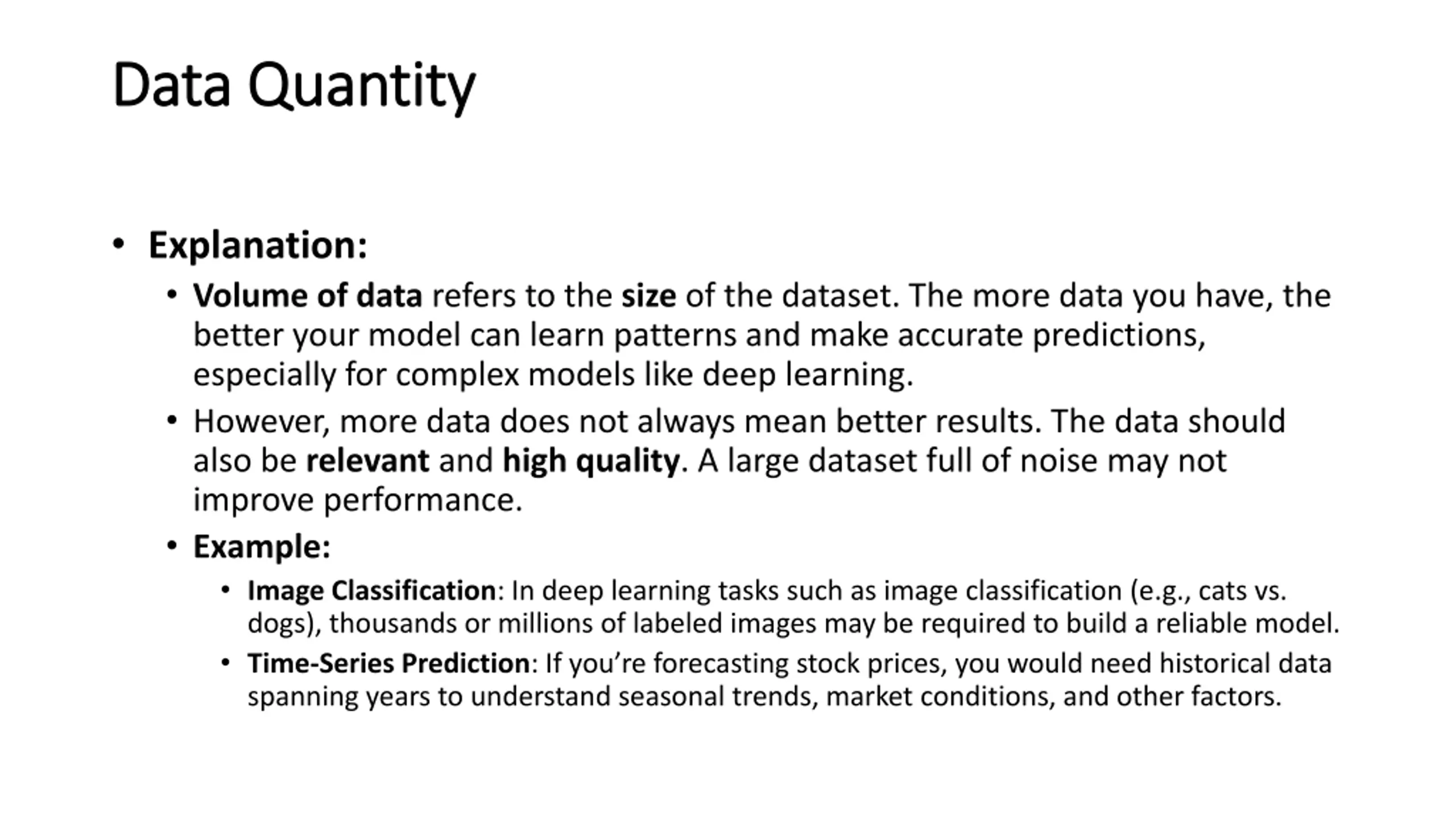 Data Quantity Data Quantity Explanation: Volume of data refers to the size of the dataset. The more data you have, the better your model can learn patterns and make accurate predictions, especially for complex models like deep learning. However, more data does not always mean better results. The data should also be relevant and high quality. A large dataset full of noise may not improve performance. Example: Image Classification: In deep learning tasks such as image classification (e.g., cats vs. dogs), thousands or millions of labeled images may be required to build a reliable model. Time-Series Prediction: If you re forecasting stock prices, you would need historical data spanning years to understand seasonal trends, market conditions, and other factors.