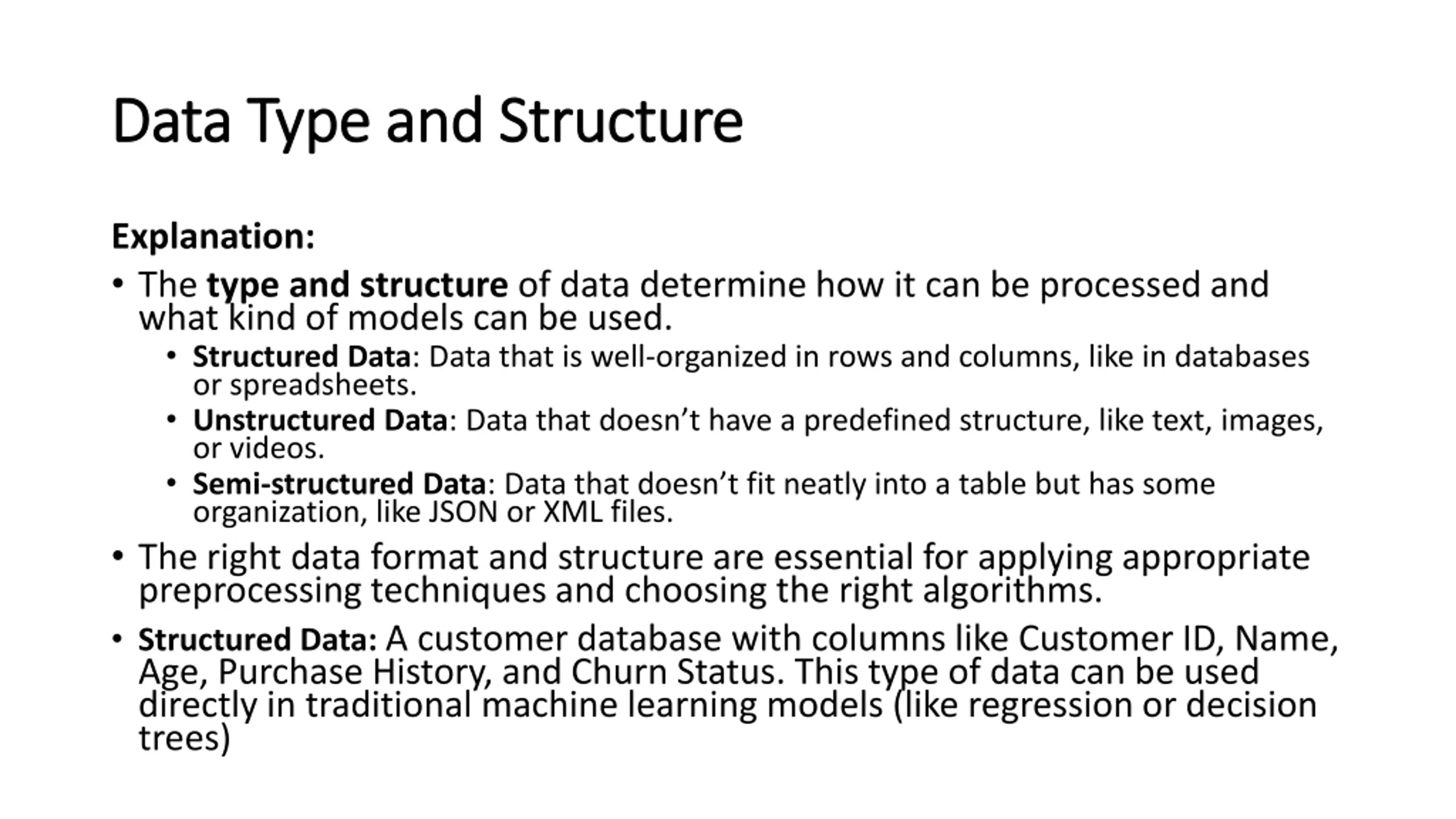 Data Type and Structure Data Type and Structure Explanation: The type and structure of data determine how it can be processed and what kind of models can be used. Structured Data: Data that is well-organized in rows and columns, like in databases or spreadsheets. Unstructured Data: Data that doesn t have a predefined structure, like text, images, or videos. Semi-structured Data: Data that doesn t fit neatly into a table but has some organization, like JSON or XML files. The right data format and structure are essential for applying appropriate preprocessing techniques and choosing the right algorithms. Structured Data: A customer database with columns like Customer ID, Name, Age, Purchase History, and Churn Status. This type of data can be used directly in traditional machine learning models (like regression or decision trees)