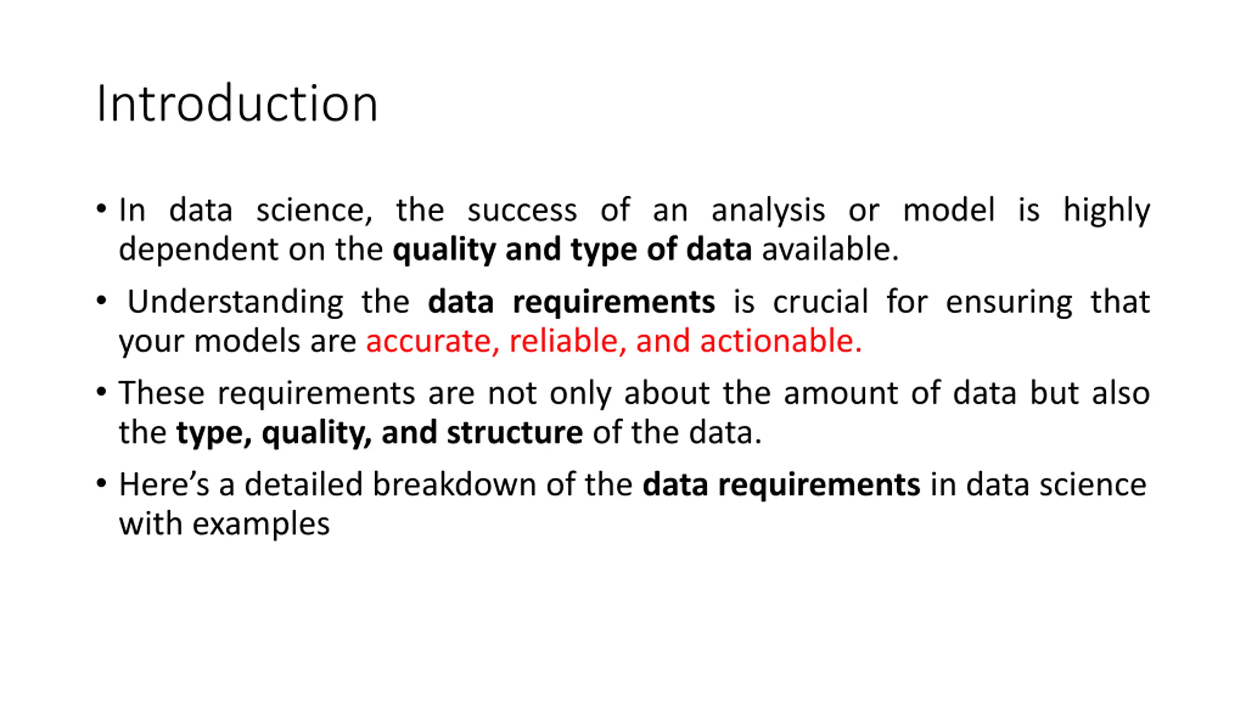 Introduction In data science, the success of an analysis or model is highly dependent on the quality and type of data available. Understanding the data requirements is crucial for ensuring that your models are accurate, reliable, and actionable. These requirements are not only about the amount of data but also the type, quality, and structure of the data. Here s a detailed breakdown of the data requirements in data science with examples