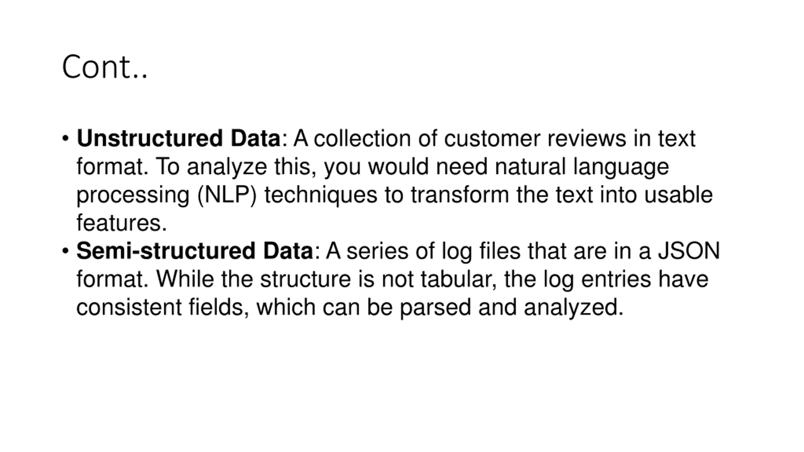 Cont.. Unstructured Data: A collection of customer reviews in text format. To analyze this, you would need natural language processing (NLP) techniques to transform the text into usable features. Semi-structured Data: A series of log files that are in a JSON format. While the structure is not tabular, the log entries have consistent fields, which can be parsed and analyzed.