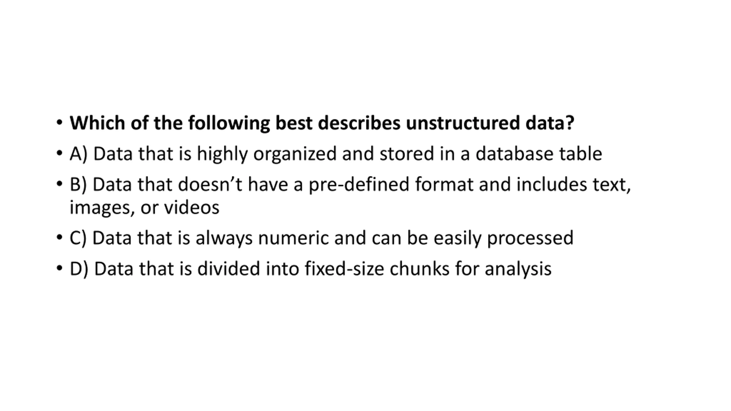 Which of the following best describes unstructured data? A) Data that is highly organized and stored in a database table B) Data that doesn t have a pre-defined format and includes text, images, or videos C) Data that is always numeric and can be easily processed D) Data that is divided into fixed-size chunks for analysis