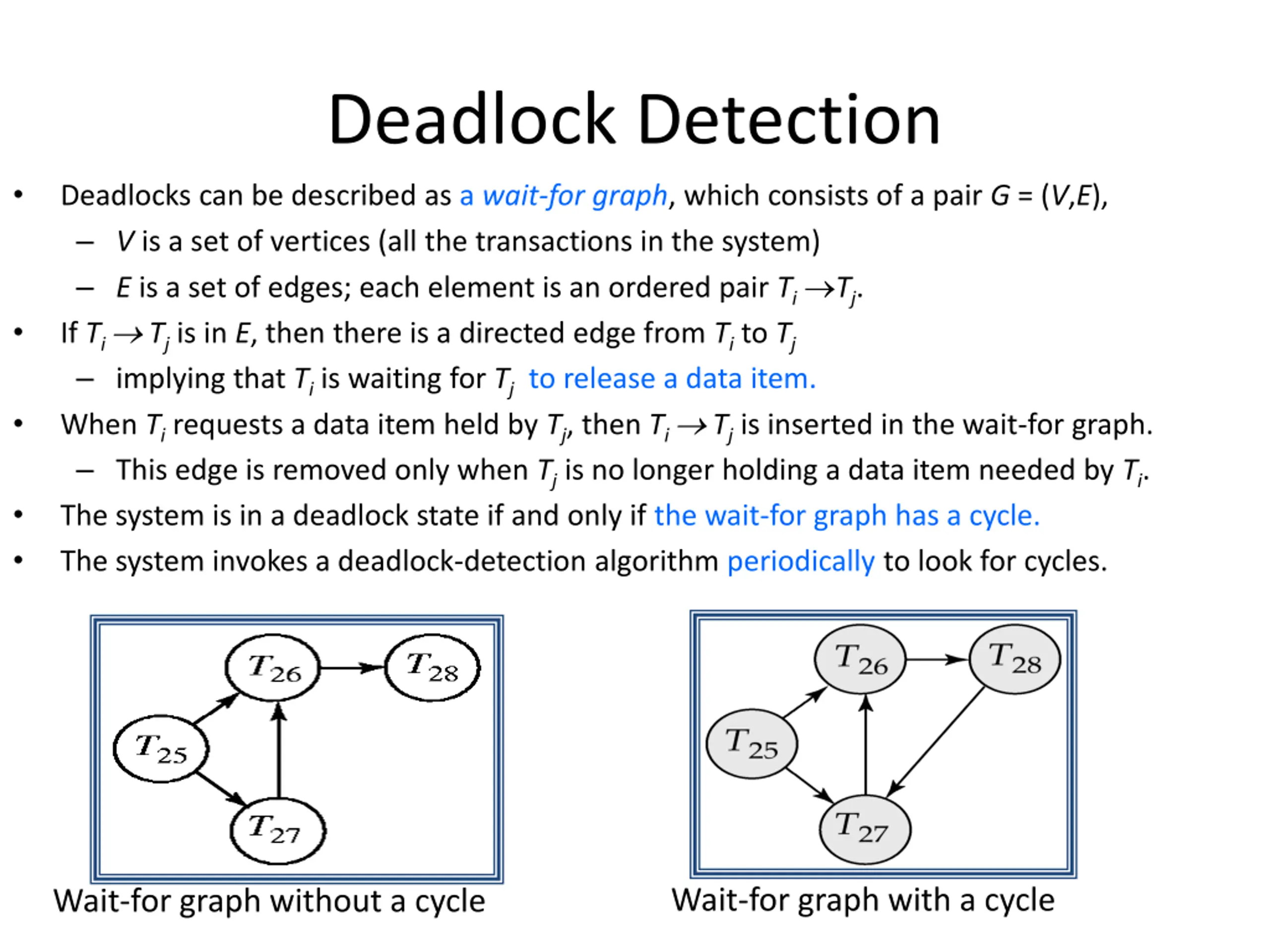 Deadlock Detection Deadlocks can be described as a wait-for graph, which consists of a pair G = (V,E), V is a set of vertices (all the transactions in the system) E is a set of edges; each element is an ordered pair Ti Tj. If Ti Tjis in E, then there is a directed edge from Ti to Tj implying that Ti is waiting for Tj to release a data item. When Ti requests a data item held by Tj, then Ti Tjis inserted in the wait-for graph. This edge is removed only when Tj is no longer holding a data item needed by Ti. The system is in a deadlock state if and only if the wait-for graph has a cycle. The system invokes a deadlock-detection algorithm periodically to look for cycles. Wait-for graph with a cycle Wait-for graph without a cycle