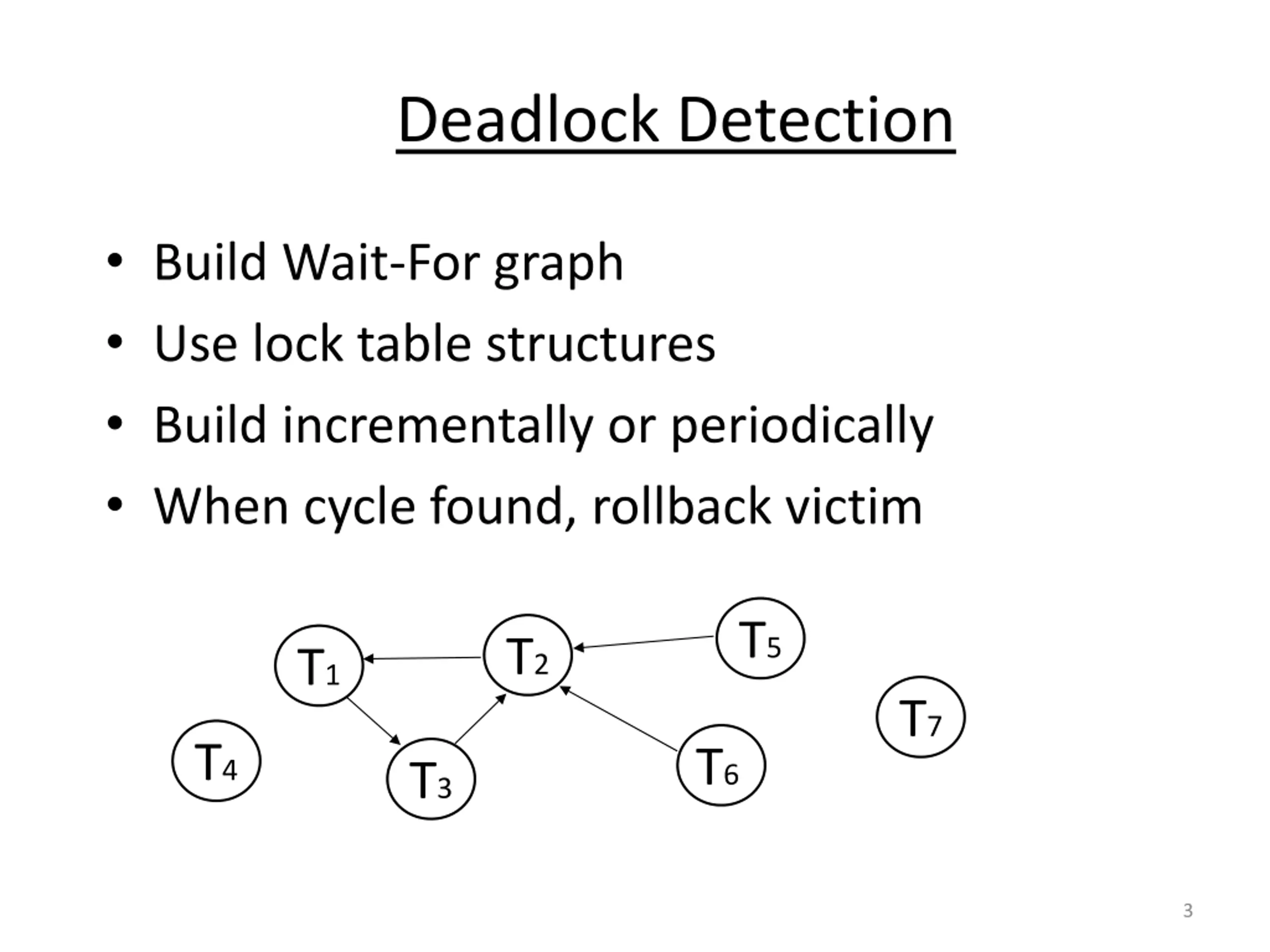 Deadlock Detection Build Wait-For graph Use lock table structures Build incrementally or periodically When cycle found, rollback victim T5 T2 T1 T7 T4 T6 T3 3