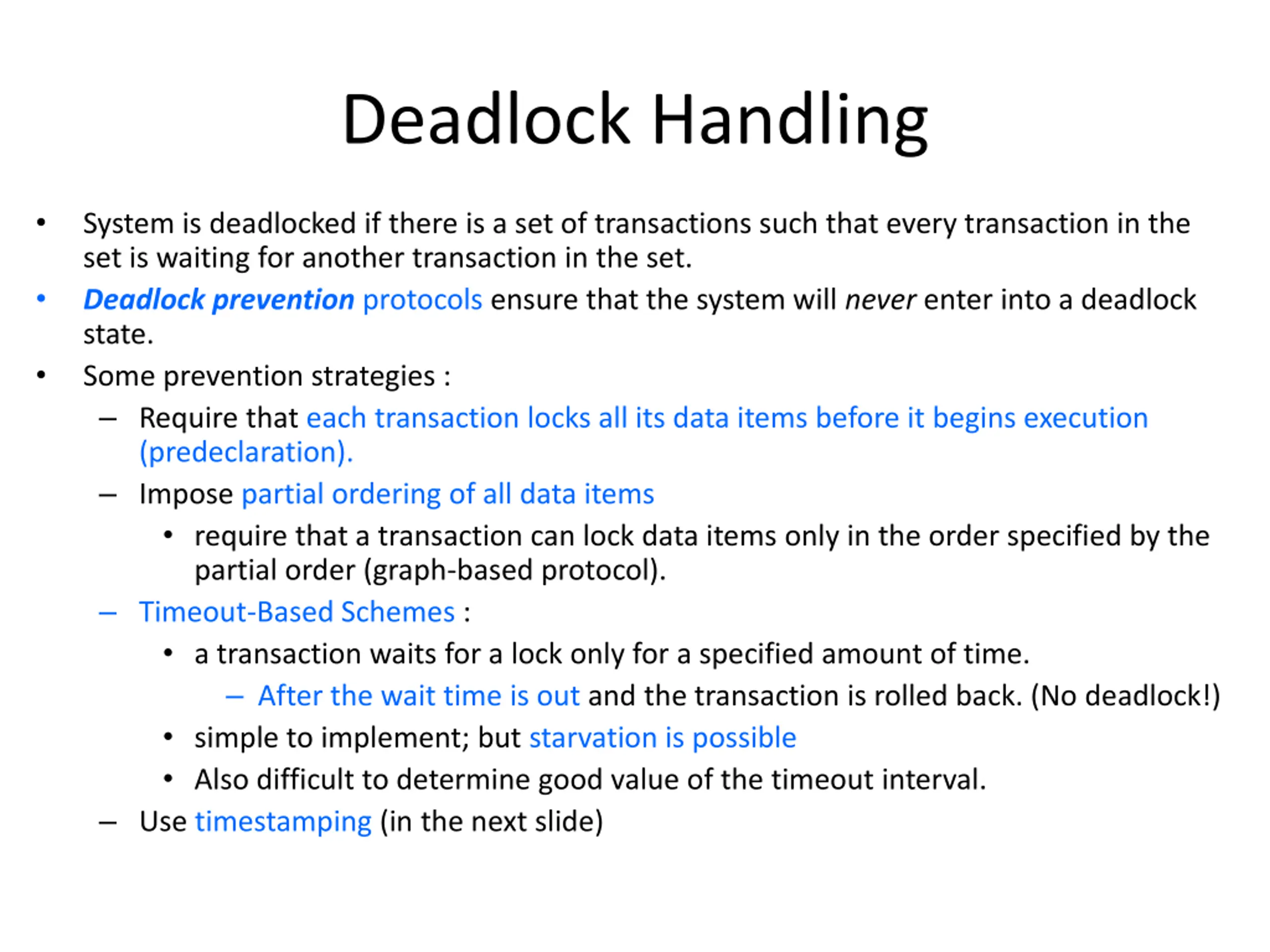 Deadlock Handling System is deadlocked if there is a set of transactions such that every transaction in the set is waiting for another transaction in the set. Deadlock prevention protocols ensure that the system will never enter into a deadlock state. Some prevention strategies : Require that each transaction locks all its data items before it begins execution (predeclaration). Impose partial ordering of all data items require that a transaction can lock data items only in the order specified by the partial order (graph-based protocol). Timeout-Based Schemes : a transaction waits for a lock only for a specified amount of time. After the wait time is out and the transaction is rolled back. (No deadlock!) simple to implement; but starvation is possible Also difficult to determine good value of the timeout interval. Use timestamping (in the next slide)