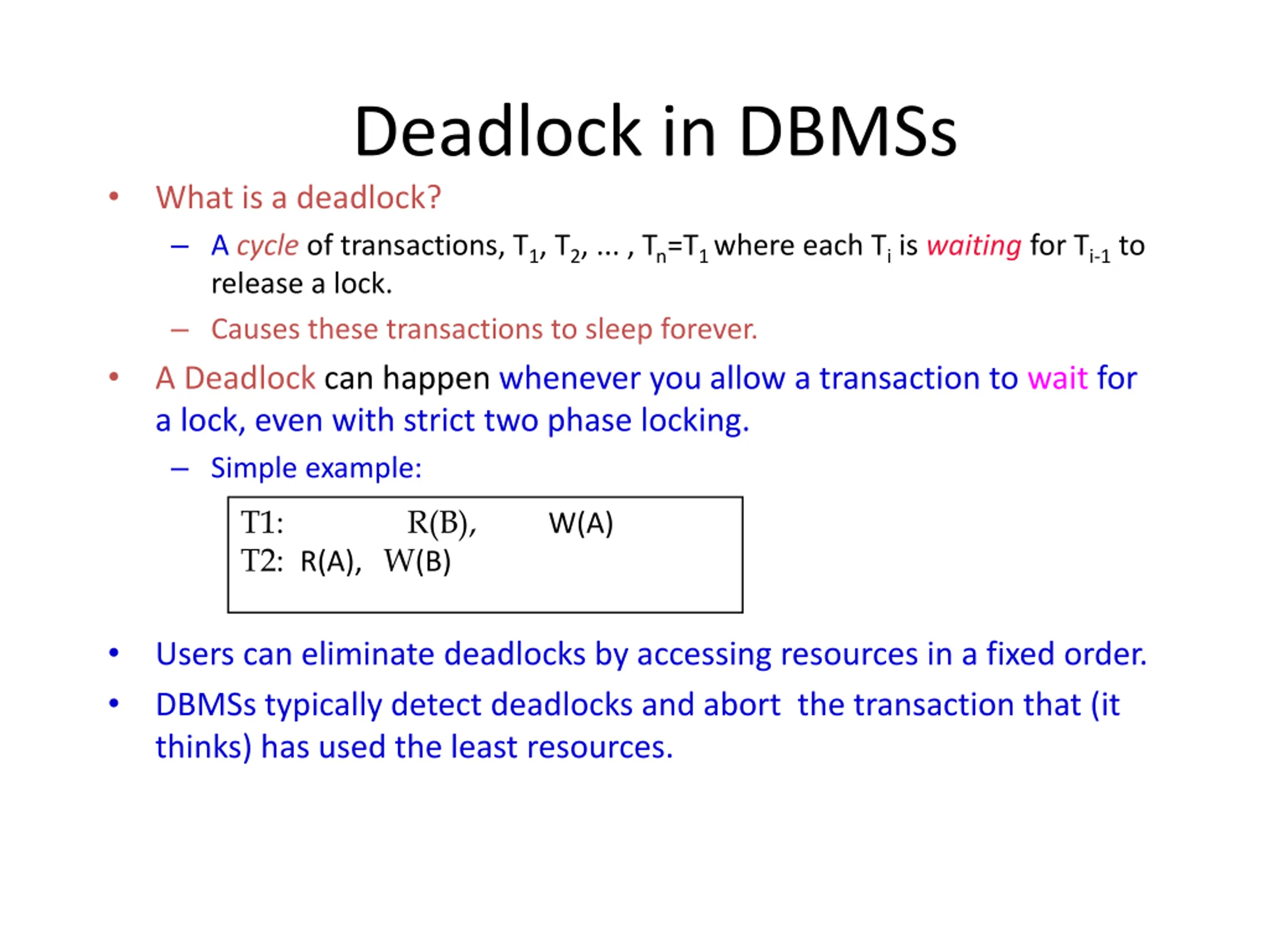 Deadlock in DBMSs What is a deadlock? A cycle of transactions, T1, T2, ... , Tn=T1 where each Ti is waiting for Ti-1 to release a lock. Causes these transactions to sleep forever. A Deadlock can happenwhenever you allow a transaction to wait for a lock, even with strict two phase locking. Simple example: T1: T2: R(A), W(B) R(B), W(A) Users can eliminate deadlocks by accessing resources in a fixed order. DBMSs typically detect deadlocks and abort the transaction that (it thinks) has used the least resources.