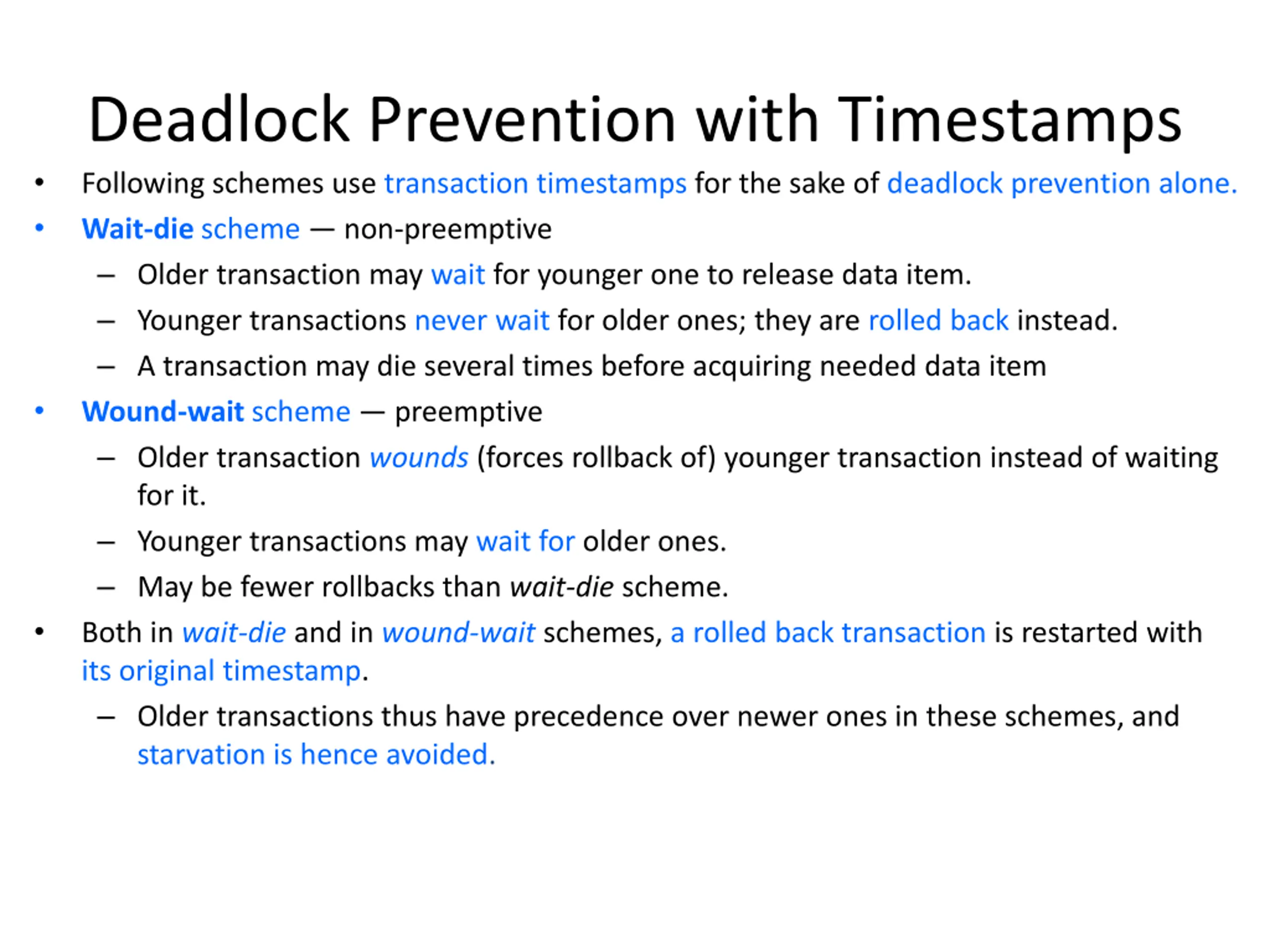 Deadlock Prevention with Timestamps Following schemes use transaction timestamps for the sake of deadlock prevention alone. Wait-die scheme non-preemptive Older transaction may wait for younger one to release data item. Younger transactions never wait for older ones; they are rolled back instead. A transaction may die several times before acquiring needed data item Wound-wait scheme preemptive Older transaction wounds (forces rollback of) younger transaction instead of waiting for it. Younger transactions may wait for older ones. May be fewer rollbacks than wait-die scheme. Both in wait-die and in wound-wait schemes, a rolled back transaction is restarted with its original timestamp. Older transactions thus have precedence over newer ones in these schemes, and starvation is hence avoided.