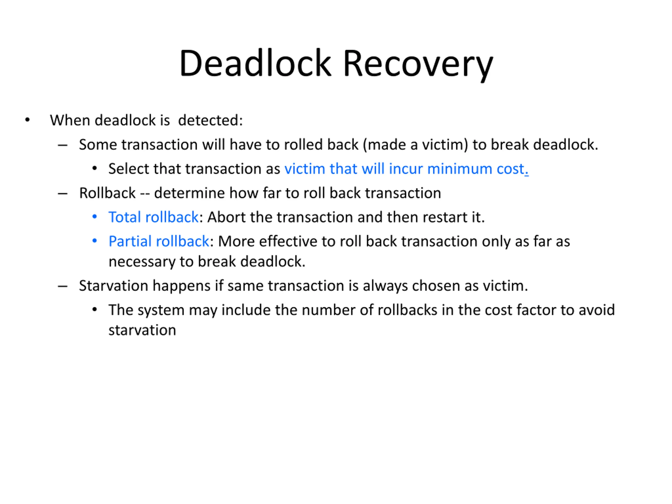 Deadlock Recovery When deadlock is detected: Some transaction will have to rolled back (made a victim) to break deadlock. Select that transaction as victim that will incur minimum cost. Rollback -- determine how far to roll back transaction Total rollback: Abort the transaction and then restart it. Partial rollback: More effective to roll back transaction only as far as necessary to break deadlock. Starvation happens if same transaction is always chosen as victim. The system may include the number of rollbacks in the cost factor to avoid starvation