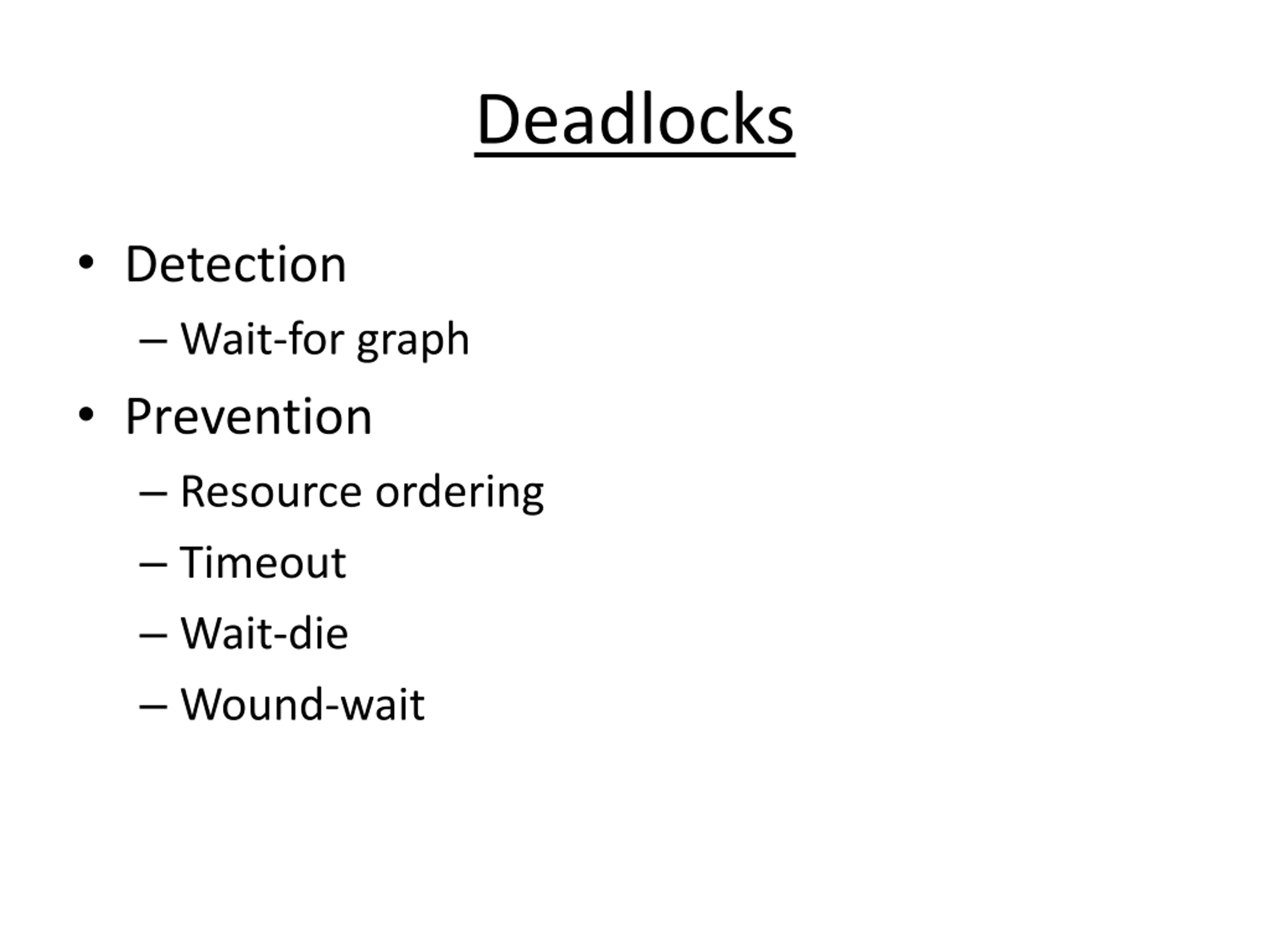 Deadlocks Detection Wait-for graph Prevention Resource ordering Timeout Wait-die Wound-wait
