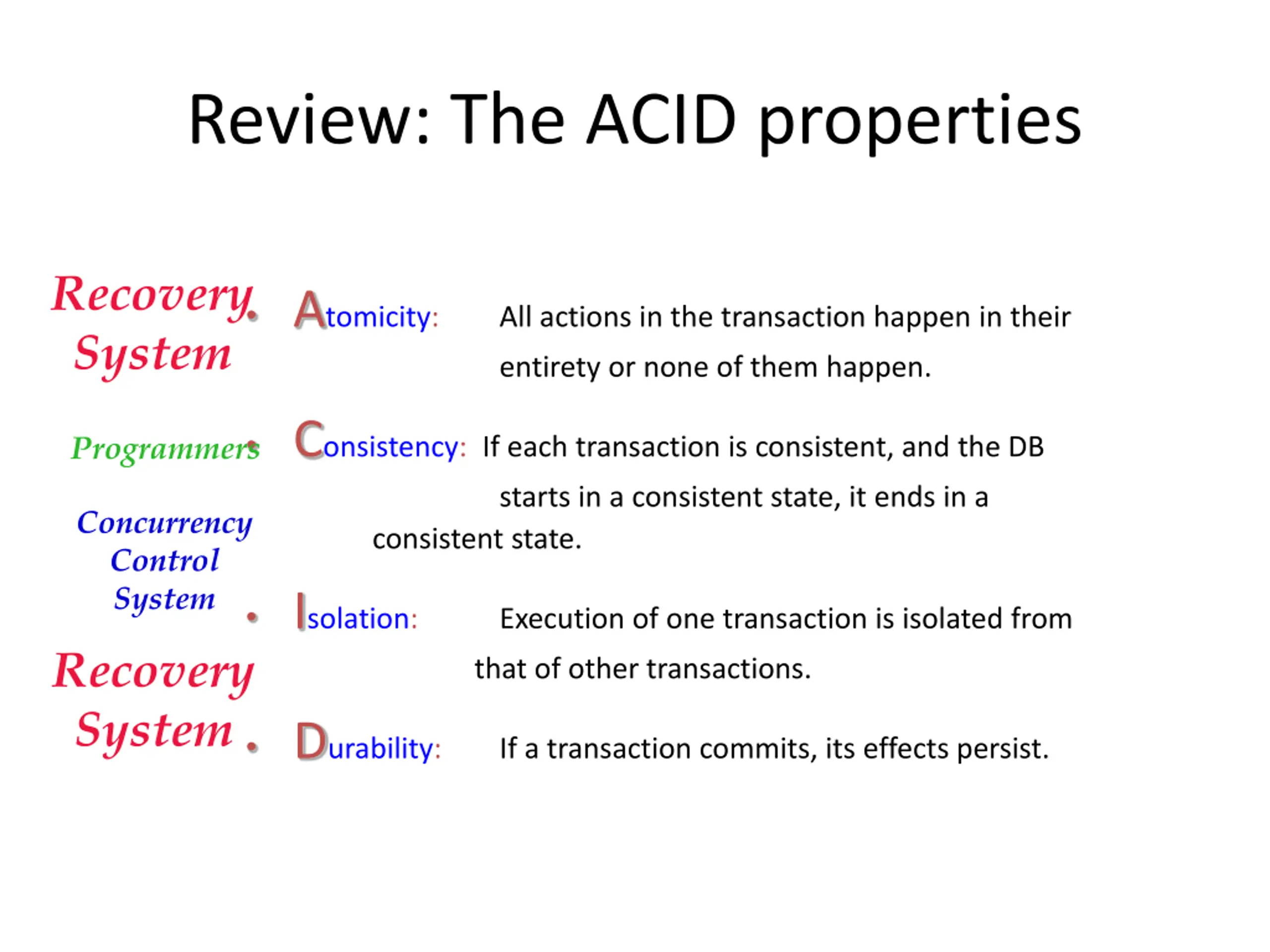 Review: The ACID properties Recovery System Atomicity: All actions in the transaction happen in their entirety or none of them happen. Consistency: If each transaction is consistent, and the DB starts in a consistent state, it ends in a consistent state. Programmers Concurrency Control System Isolation: Execution of one transaction is isolated from Recovery System that of other transactions. Durability: If a transaction commits, its effects persist.