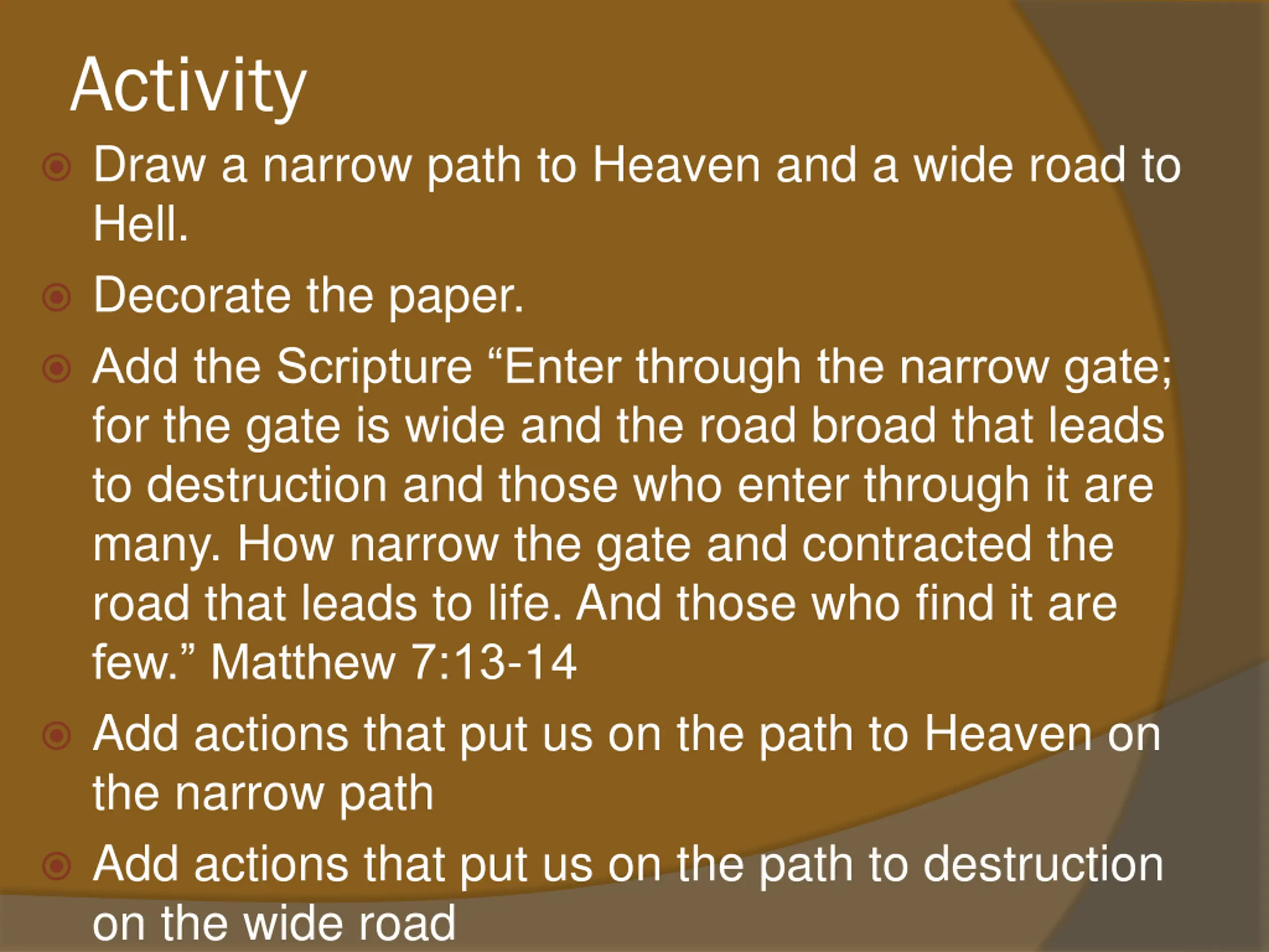 Activity Draw a narrow path to Heaven and a wide road to Hell. Decorate the paper. Add the Scripture Enter through the narrow gate; for the gate is wide and the road broad that leads to destruction and those who enter through it are many. How narrow the gate and contracted the road that leads to life. And those who find it are few. Matthew 7:13-14 Add actions that put us on the path to Heaven on the narrow path Add actions that put us on the path to destruction on the wide road