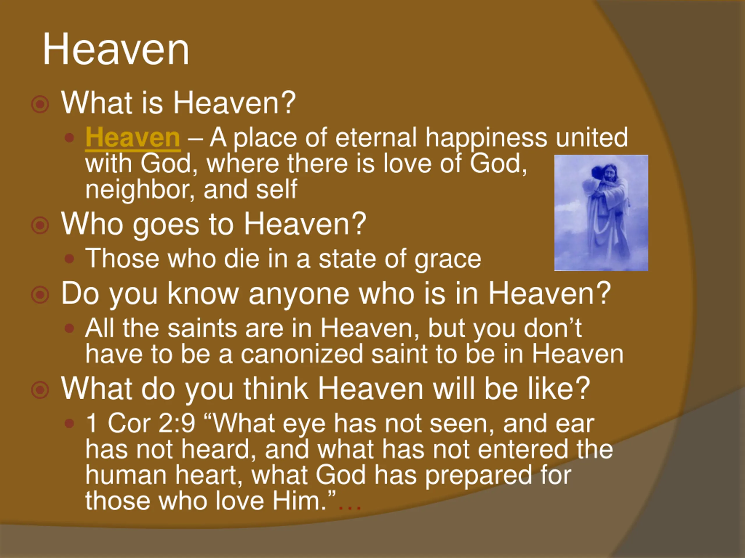 Heaven What is Heaven? Heaven A place of eternal happiness united with God, where there is love of God, neighbor, and self Who goes to Heaven? Those who die in a state of grace Do you know anyone who is in Heaven? All the saints are in Heaven, but you don t have to be a canonized saint to be in Heaven What do you think Heaven will be like? 1 Cor 2:9 What eye has not seen, and ear has not heard, and what has not entered the human heart, what God has prepared for those who love Him.