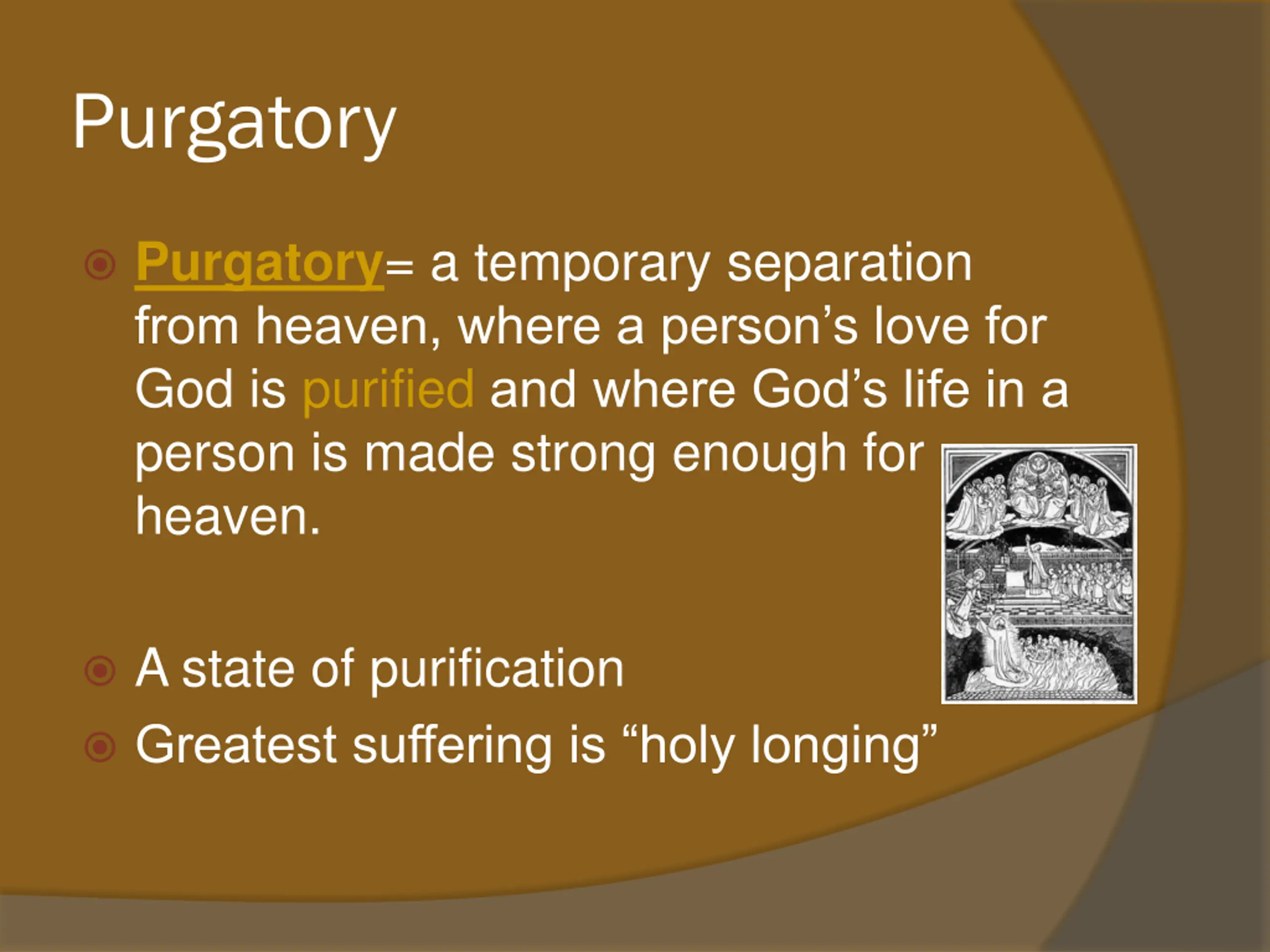 Purgatory Purgatory= a temporary separation from heaven, where a person s love for God is purified and where God s life in a person is made strong enough for heaven. A state of purification Greatest suffering is holy longing