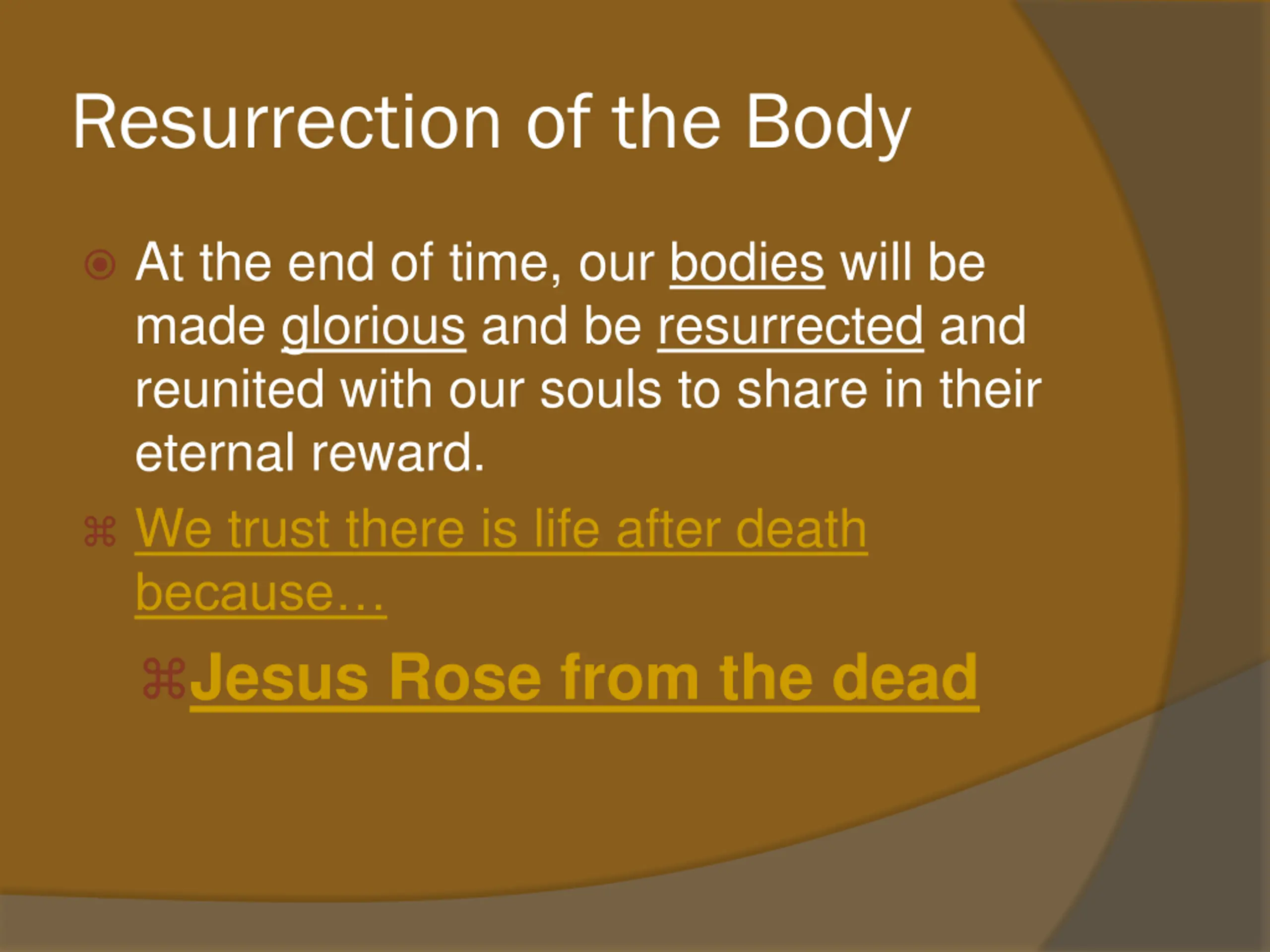 Resurrection of the Body At the end of time, our bodies will be made glorious and be resurrected and reunited with our souls to share in their eternal reward. We trust there is life after death because Jesus Rose from the dead