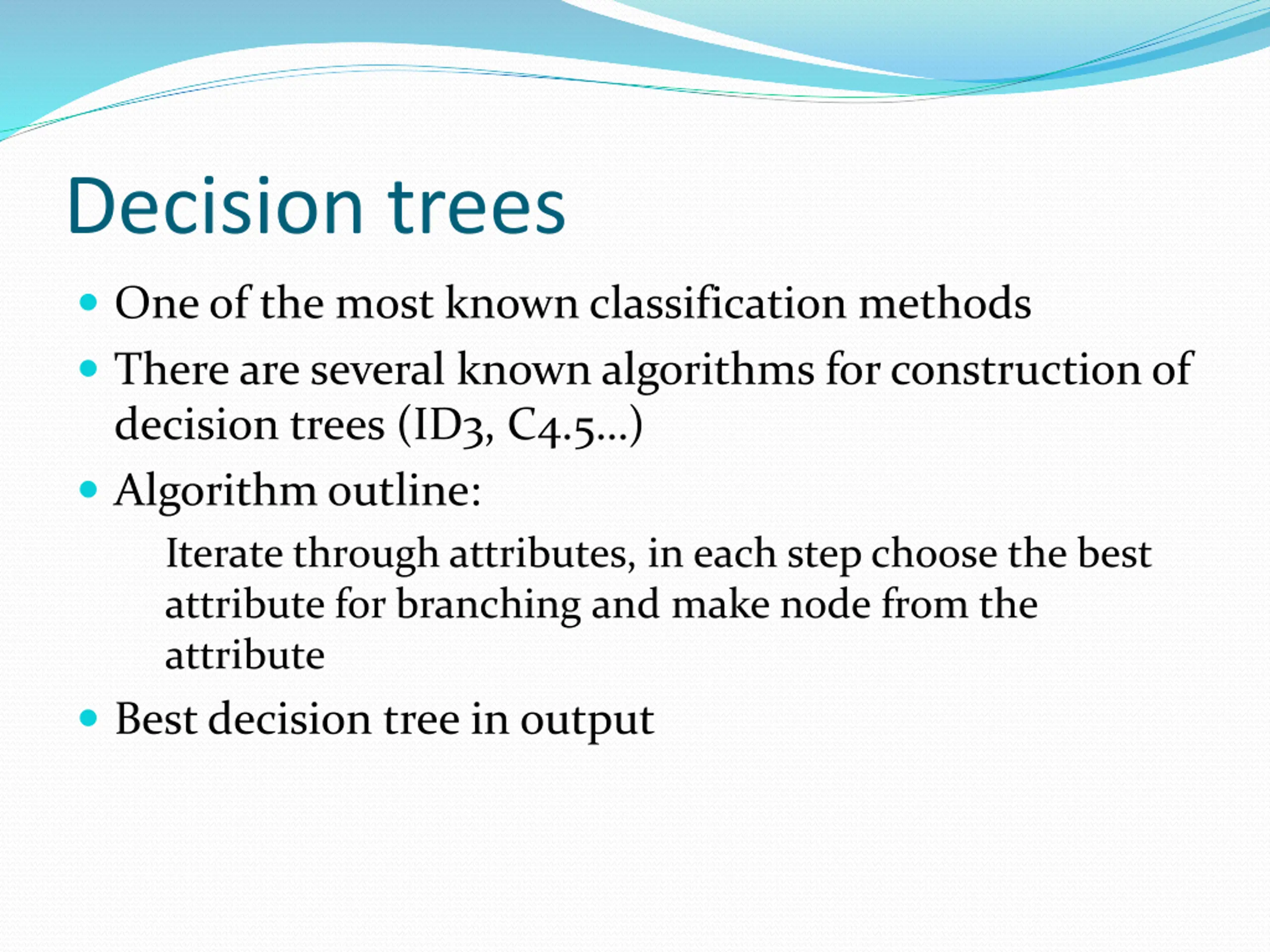 Decision trees One of the most known classification methods There are several known algorithms for construction of decision trees (ID3, C4.5 ) Algorithm outline: Iterate through attributes, in each step choose the best attribute for branching and make node from the attribute Best decision tree in output