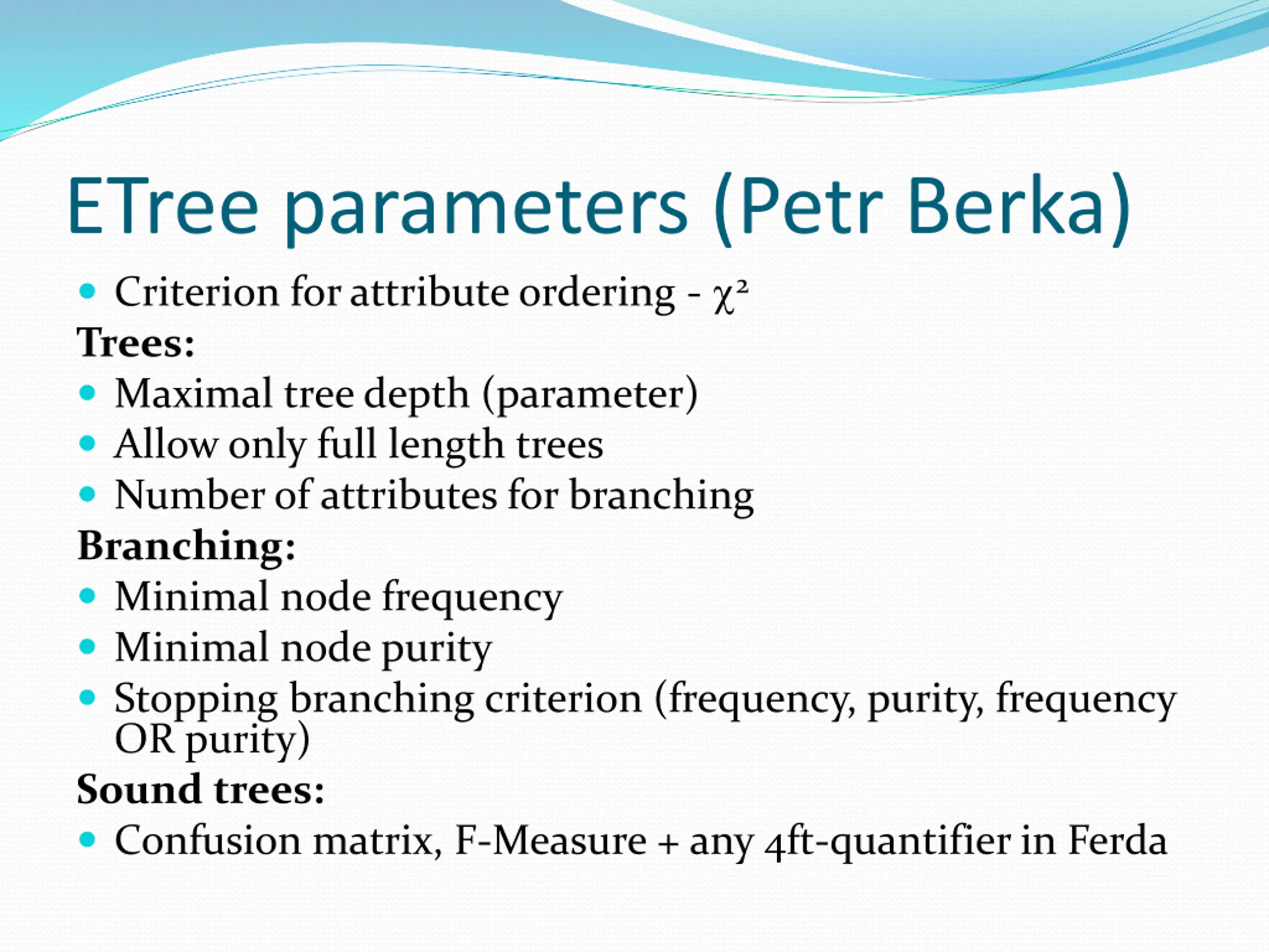 ETree parameters (Petr Berka) Criterion for attribute ordering - 2 Trees: Maximal tree depth (parameter) Allow only full length trees Number of attributes for branching Branching: Minimal node frequency Minimal node purity Stopping branching criterion (frequency, purity, frequency OR purity) Sound trees: Confusion matrix, F-Measure + any 4ft-quantifier in Ferda
