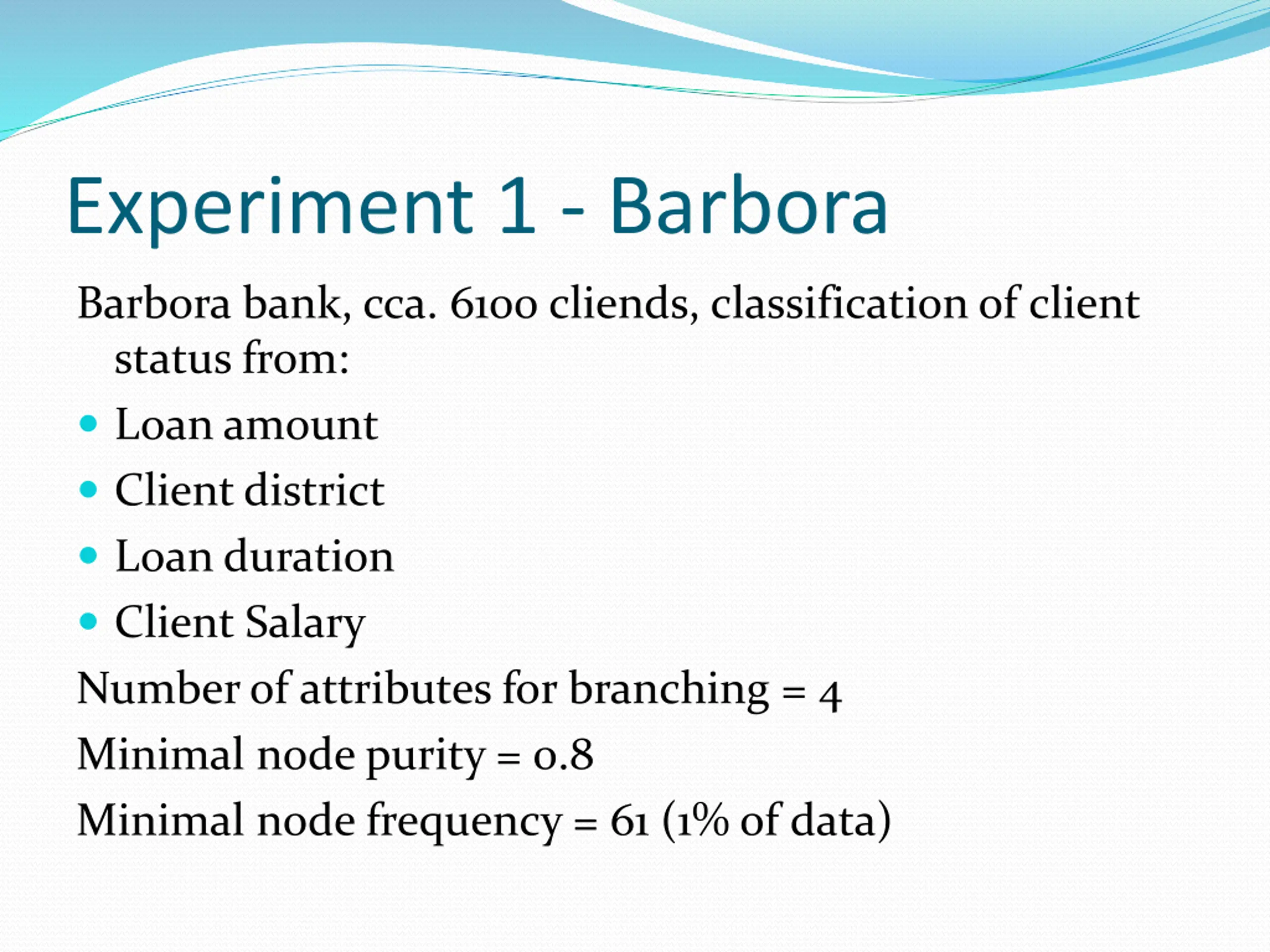 Experiment 1 - Barbora Barbora bank, cca. 6100 cliends, classification of client status from: Loan amount Client district Loan duration Client Salary Number of attributes for branching = 4 Minimal node purity = 0.8 Minimal node frequency = 61 (1% of data)