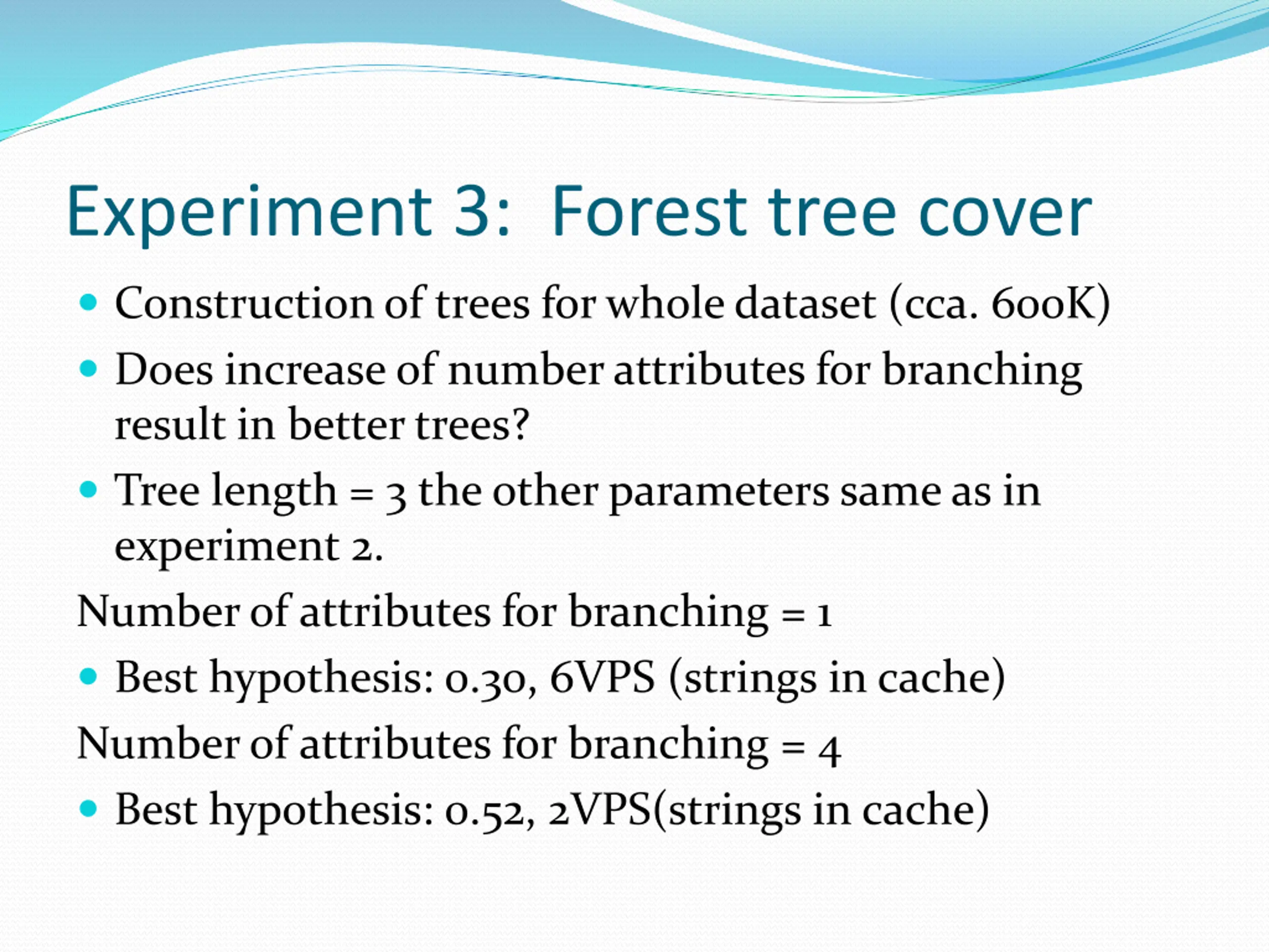 Experiment 3: Forest tree cover Construction of trees for whole dataset (cca. 600K) Does increase of number attributes for branching result in better trees? Tree length = 3 the other parameters same as in experiment 2. Number of attributes for branching = 1 Best hypothesis: 0.30, 6VPS (strings in cache) Number of attributes for branching = 4 Best hypothesis: 0.52, 2VPS(strings in cache)