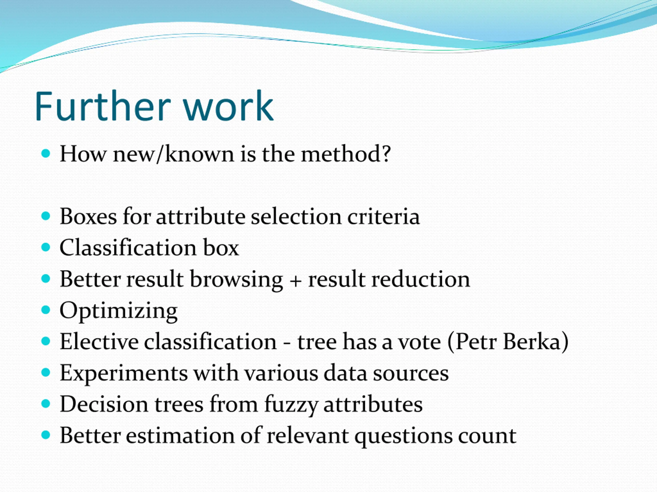 Further work How new/known is the method? Boxes for attribute selection criteria Classification box Better result browsing + result reduction Optimizing Elective classification - tree has a vote (Petr Berka) Experiments with various data sources Decision trees from fuzzy attributes Better estimation of relevant questions count
