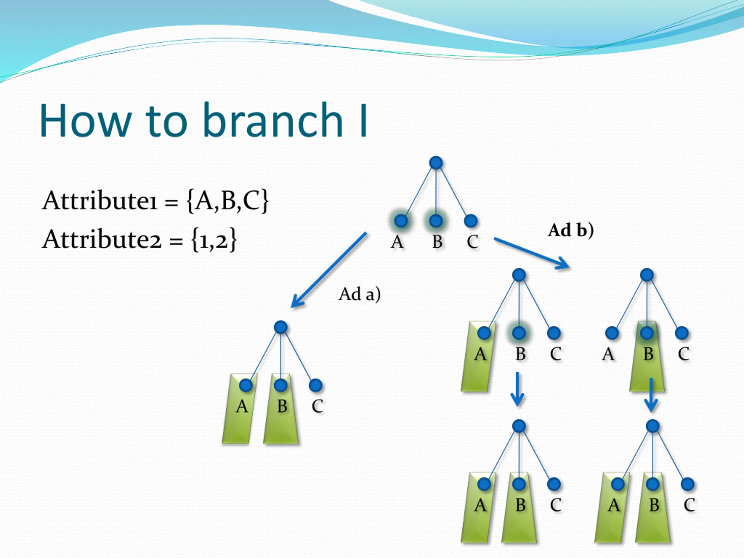 How to branch II Attribute1 = {A,B,C} Attribute2 = {1,2} Ad a) Ad b) A B C A B C A B C A B C A B C 1 2 2 1 2 1