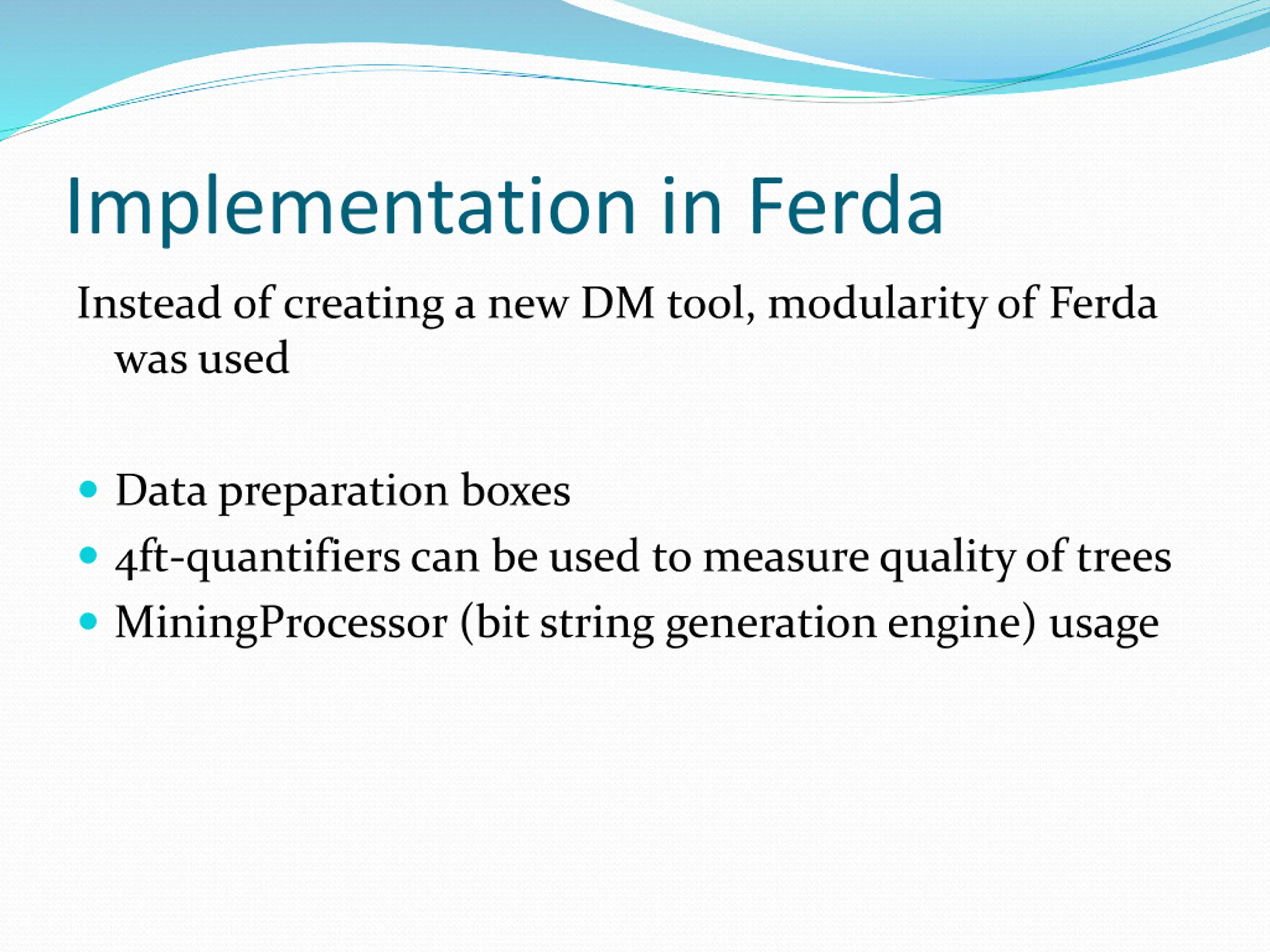 Implementation in Ferda Instead of creating a new DM tool, modularity of Ferda was used Data preparation boxes 4ft-quantifiers can be used to measure quality of trees MiningProcessor (bit string generation engine) usage