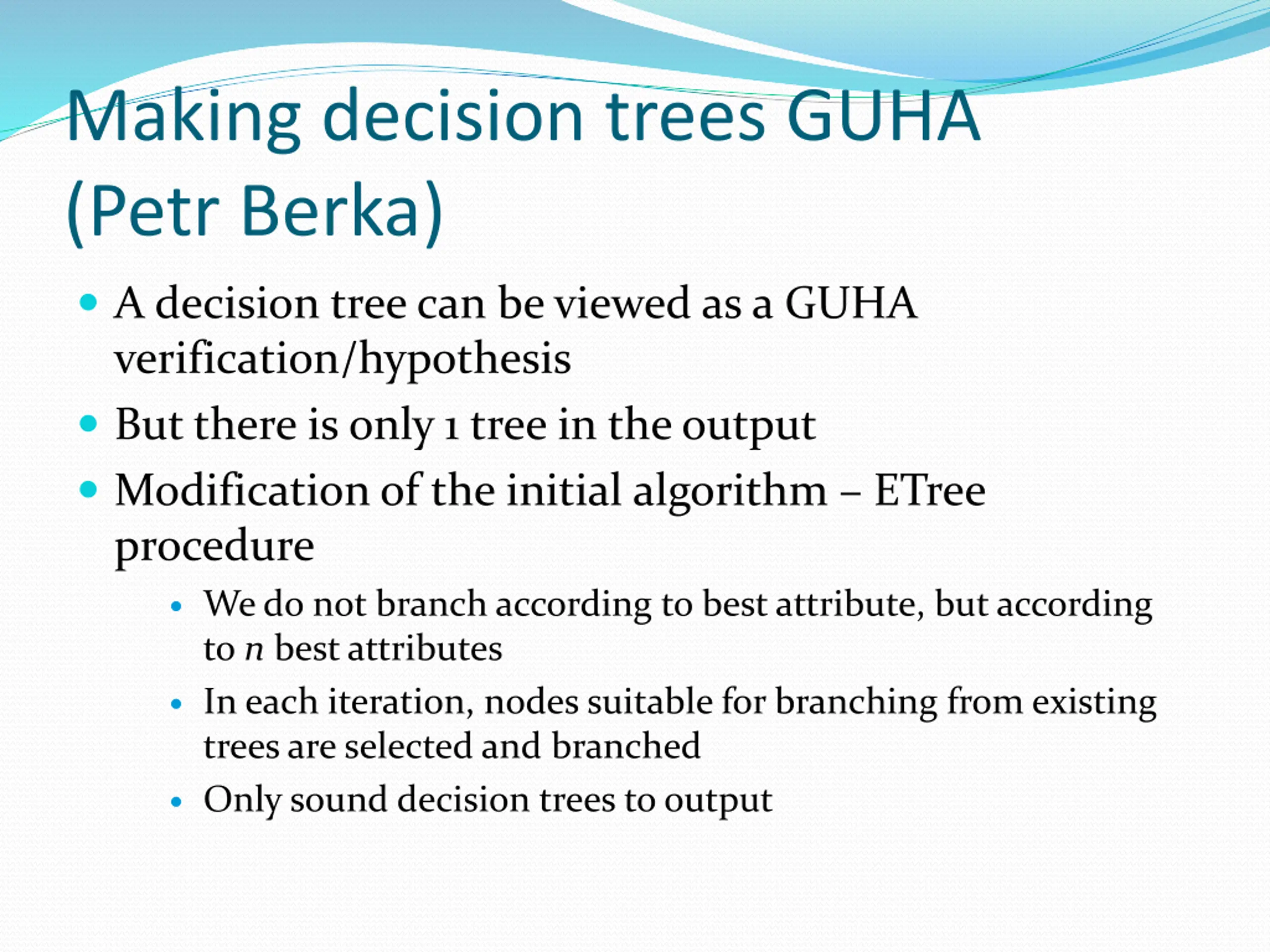 Making decision trees GUHA (Petr Berka) A decision tree can be viewed as a GUHA verification/hypothesis But there is only 1 tree in the output Modification of the initial algorithm ETree procedure We do not branch according to best attribute, but according to n best attributes In each iteration, nodes suitable for branching from existing trees are selected and branched Only sound decision trees to output
