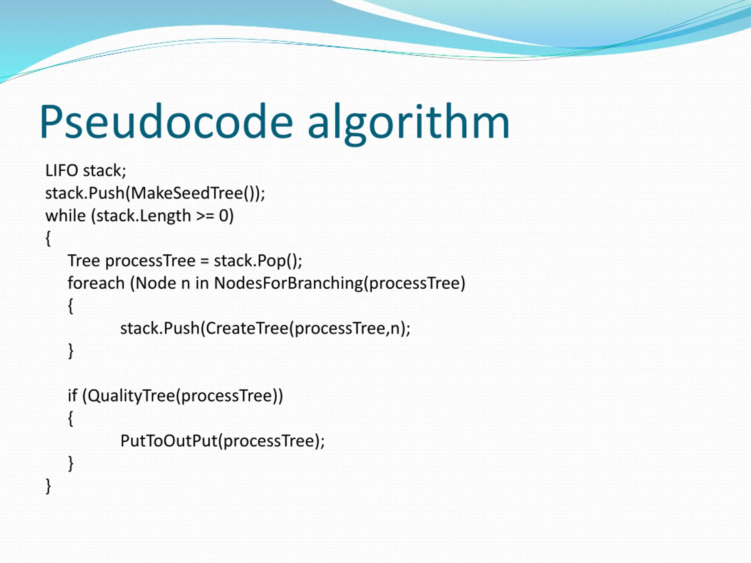 Pseudocode algorithm LIFO stack; stack.Push(MakeSeedTree()); while (stack.Length >= 0) { Tree processTree = stack.Pop(); foreach (Node n in NodesForBranching(processTree) { stack.Push(CreateTree(processTree,n); } if (QualityTree(processTree)) { PutToOutPut(processTree); } }