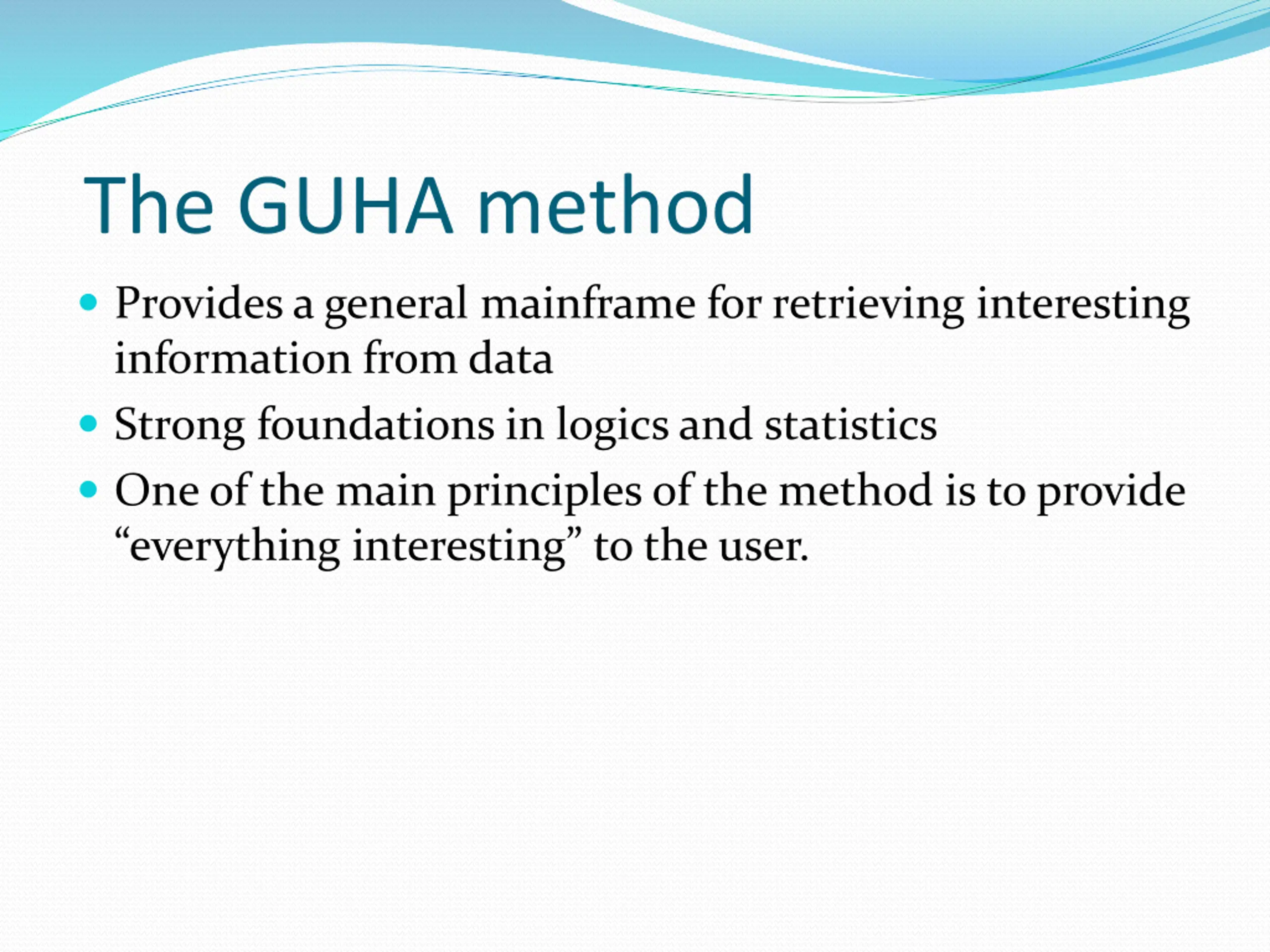 The GUHA method Provides a general mainframe for retrieving interesting information from data Strong foundations in logics and statistics One of the main principles of the method is to provide everything interesting to the user.