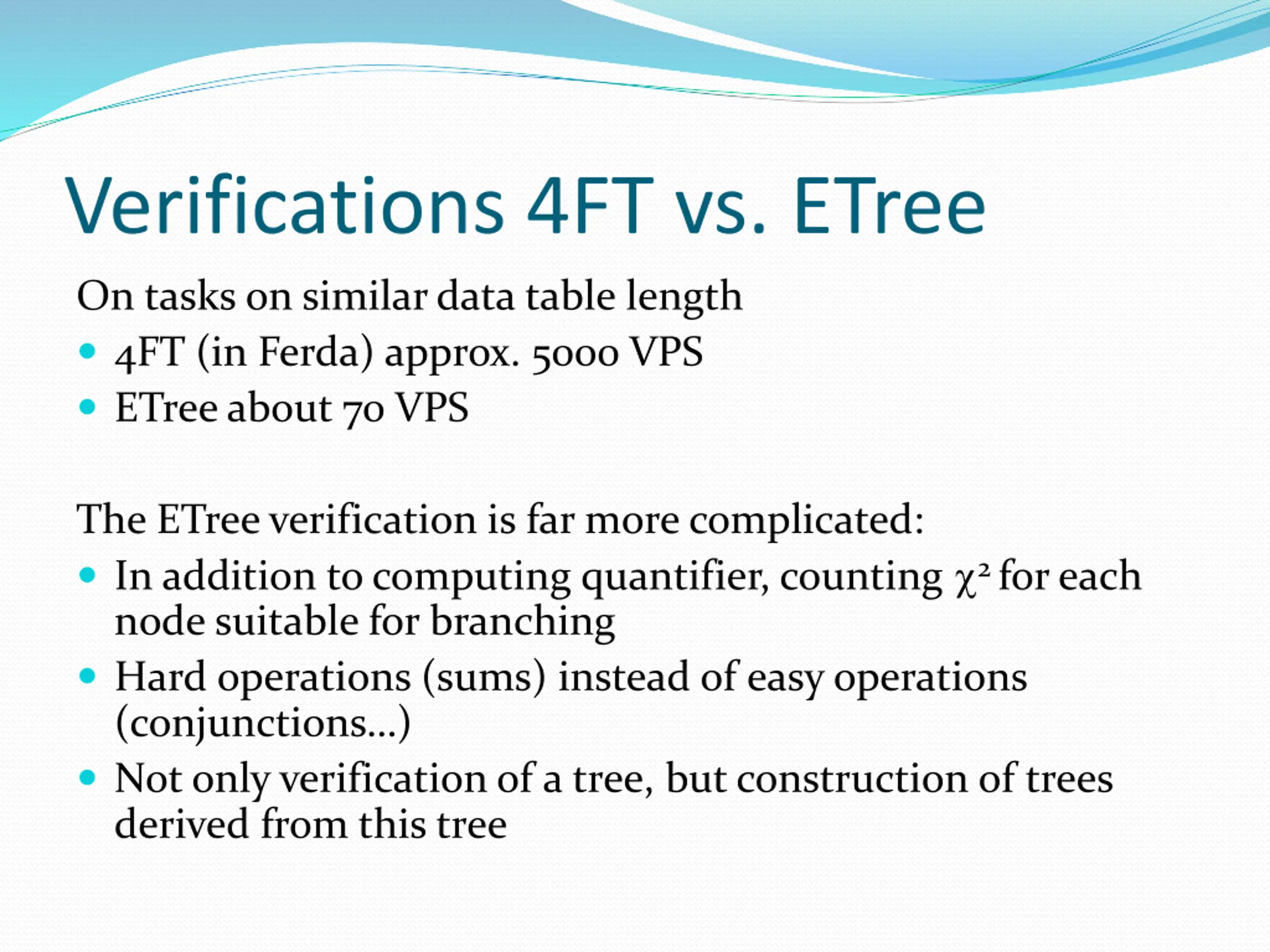 Verifications 4FT vs. ETree On tasks on similar data table length 4FT (in Ferda) approx. 5000 VPS ETree about 70 VPS The ETreeverification is far more complicated: In addition to computing quantifier, counting 2 for each node suitable for branching Hard operations (sums) instead of easy operations (conjunctions ) Not only verification of a tree, but construction of trees derived from this tree